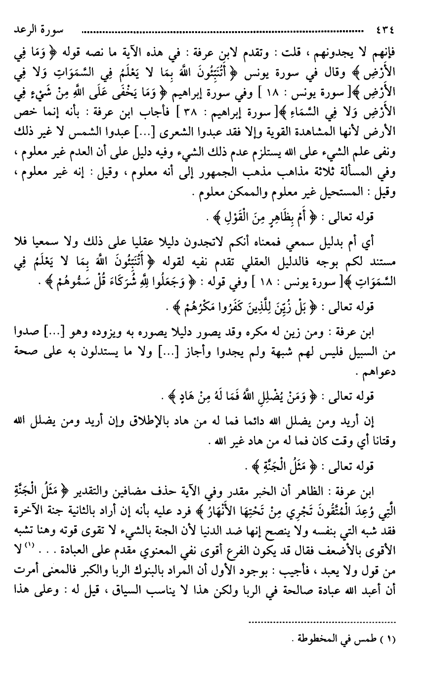 ابن عرفة: ومن زين له مكره وقد يصور دليلا يصوره به ويزوده وهو [ ... ] صدوا عن السبيل فليس لهم شبهة ولم يجدوا وأجاز [ ... ] ولا ما يستدلون به على صحة دعواهم.