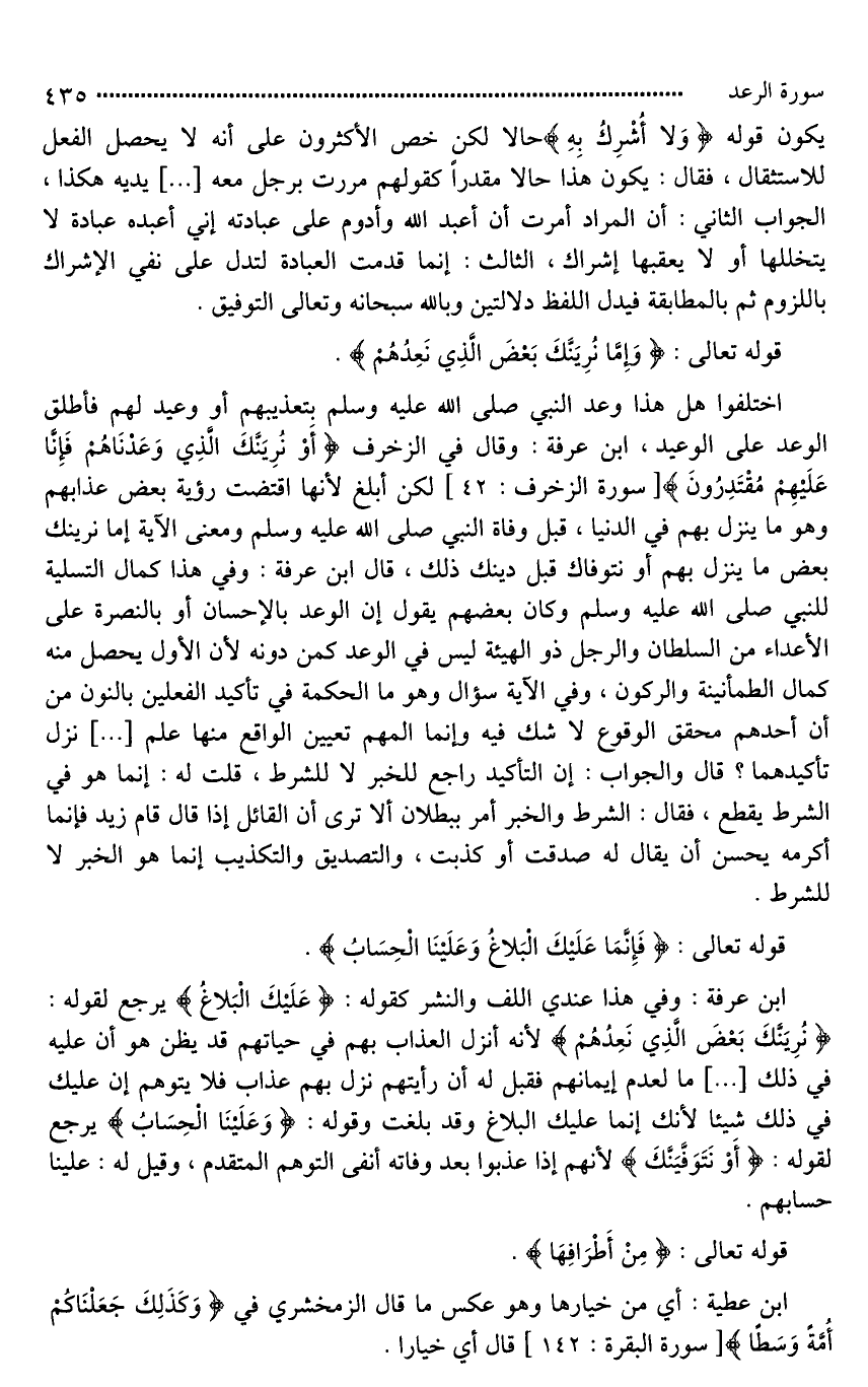 ابن عرفة: وفي هذا عندي اللف والنشر كقوله: (عَلَيْكَ الْبَلَاغُ) يرجع لقوله: (نُرِيَنَّكَ بَعْضَ الَّذِي نَعِدُهُمْ) لأنه أنزل العذاب بهم في حياتهم قد يظن هو أن عليه في ذلك [ ... ] ما لعدم إيمانهم فقبل له أن رأيتهم نزل بهم عذاب فلا يتوهم إن عليك في ذلك شيئا لأنك إنما عليك البلاغ وقد بلغت وقوله: (وَعَلَيْنَا الْحِسَابُ) يرجع لقوله: (أَوْ نَتَوَفَّيَنكَ) لأنهم إذا عذبوا بعد وفاته أنفى التوهم المتقدم، وقيل له: علينا حسابهم.