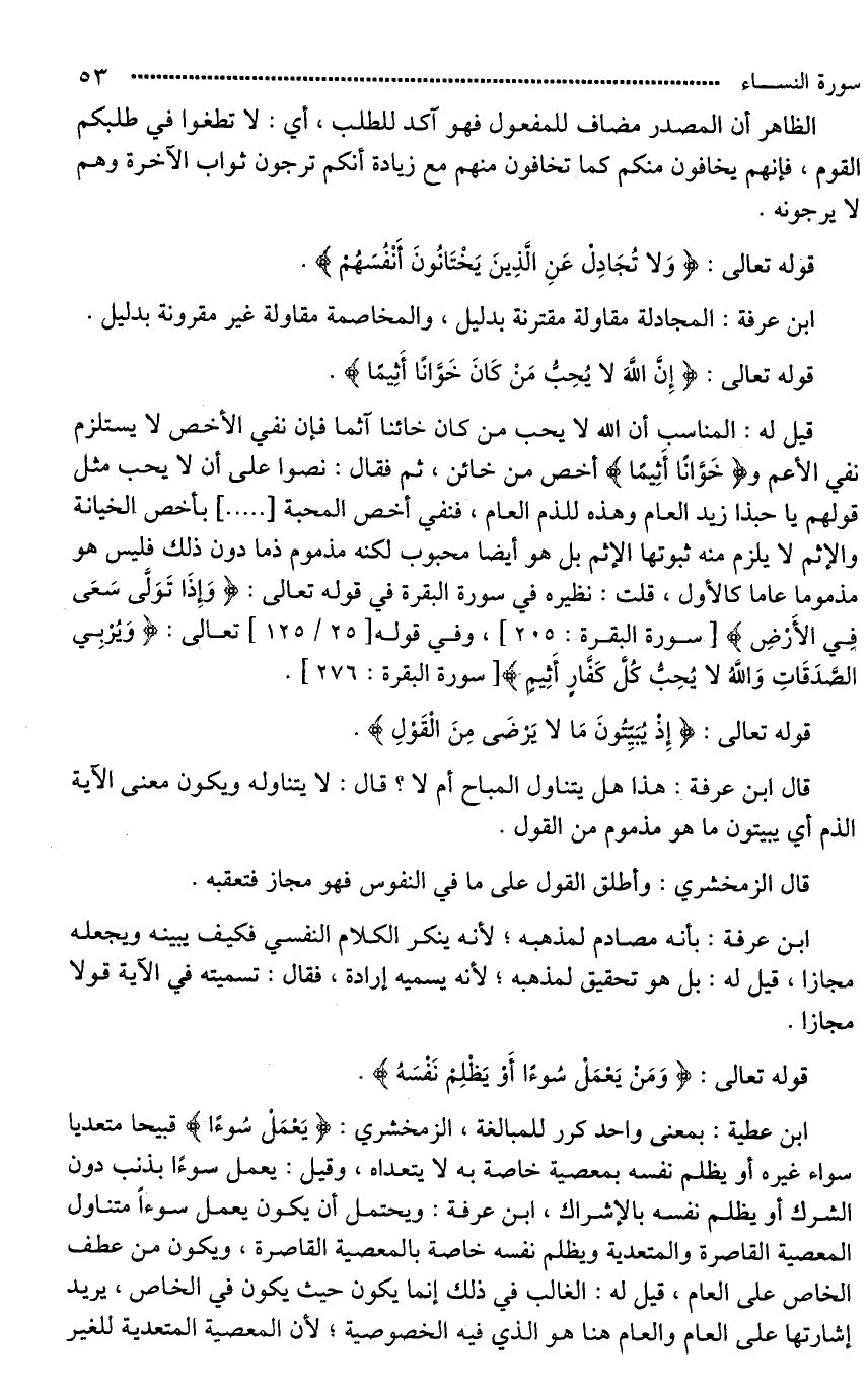 قيل له: المناسب أن الله لَا يحب من كان خائنا آثما فإن نفي الأخص لَا يستلزم نفي الأعم و (خَوَّانًا أَثِيمًا) أخص من خائن، ثم فقال: نصوا على أن لَا يحب مثل قولهم يا حبذا زيد العام وهذه للذم العام، فنفي أخص المحبة بأخص الخيانة والإثم لَا يلزم منه ثبوتها الإثم بل هو أيضا محبوب لكنه مذموم ذما دون ذلك فليس هو مذموما عاما كالأول، قلت: نظيره في سورة البقرة في قوله تعالى: (وَإِذَا تَوَلَّى سَعَى فِي الْأَرْضِ)، وفي قوله تعالى: (وَيُرْبِي الصَّدَقَاتِ وَاللَّهُ لَا يُحِبُّ كُلَّ كَفَّارٍ أَثِيمٍ).