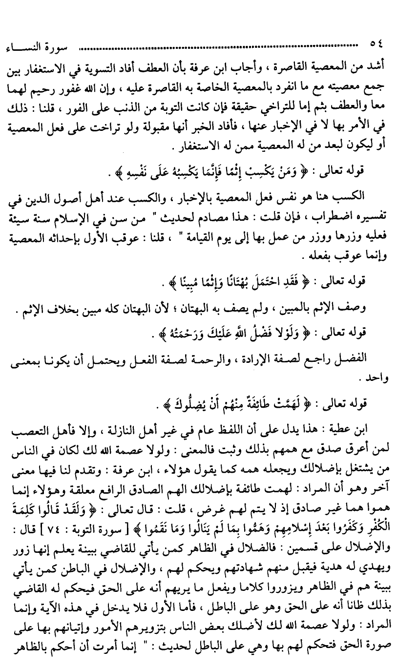 ابن عطية: هذا يدل على أن اللفظ عام في غير أهل النازلة، وإلا فأهل التعصب [لبني أبيرق قد وقع همم وثبت*] فالمعنى: ولولا عصمة الله لك لكان في النَّاس من يشتغل بإضلالك ويجعله همه كما يقول هؤلاء، ابن عرفة: وتقدم لنا فيها معنى آخر وهو أن المراد: لهمت طائفة بإضلالك الهم الصادق الرافع معلقة وهؤلاء إنما هموا هما غير صادق إذ لَا يتم لهم غرض، قلت: قال تعالى: (وَلَقَدْ قَالُوا كَلِمَةَ الْكُفْرِ وَكَفَرُوا بَعْدَ إِسْلَامِهِمْ وَهَمُّوا بِمَا لَمْ يَنَالُوا وَمَا نَقَمُوا) قال: والإضلال على قسمين: فالضلال في الظاهر كمن يأتي للقاضي ببينة يعلم إنها زور ويهدي له هدية فيقبل منهم شهادتهم ويحكم لهم، والإضلال في الباطن كمن يأتي ببينة هم في الظاهر ويزوروا كلاما ويفعل ما يريهم أنه على الحق فيحكم له القاضي بذلك ظانا أنه على الحق وهو على الباطل، فأما الأول فلا يدخل في هذه الآية وإنما المراد: ولولا عصمة الله لك لأضلك بعض النَّاس بتزويرهم الأمور وإتيانهم بها على صورة الحق فتحكم لهم بها وهي على الباطل لحديث: "إنما أمرت أن أحكم بالظاهر