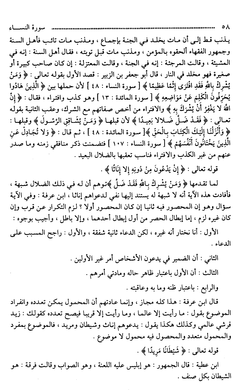 لما تقدمها (وَمَنْ يُشرِكْ بِاللَّهِ فَقَدْ ضَلَّ) توهم أن له في ذلك الضلال شبهة، فأفادت هذه الآية أنه لَا شبهة له يستند إليها نفي لدعواهم إناثا، ابن عرفة: وفي الآية سؤال وهو إن المحصور فيه ثانيا إن كان المحصور أولا ألزم التكرار عن قرب وإن كان غيره لزم، إما إبطال الحصر من أول إبطال أحدهما، وإلا باطل، وأجيب بوجوه: