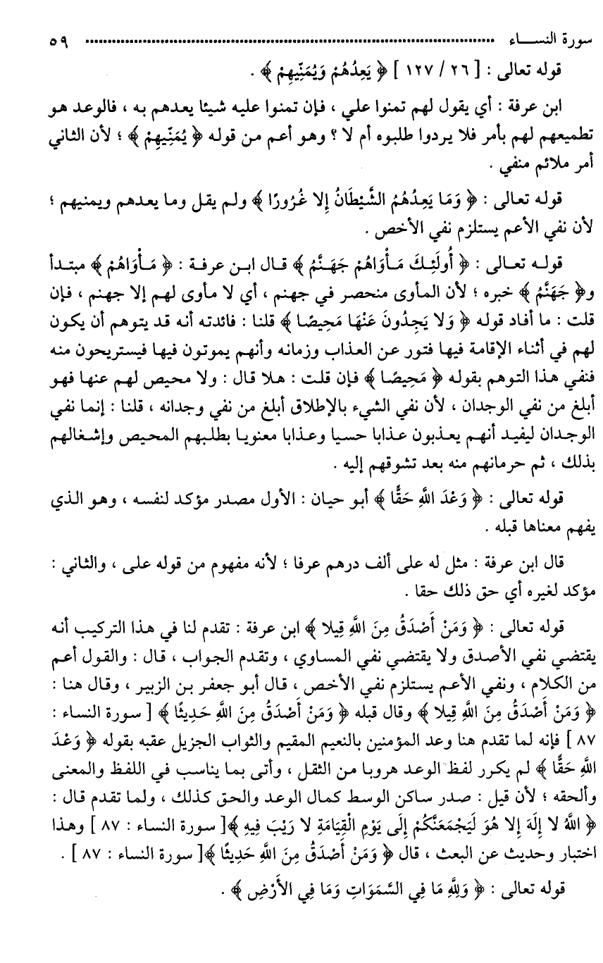 قوله تعالى: (وَمَنْ أَصْدَقُ مِنَ اللَّهِ قِيلًا) ابن عرفة: تقدم لنا في هذا التركيب أنه يقتضي نفي الأصدق ولا يقتضي نفي المساوي، وتقدم الجواب، قال: والقول أعم من الكلام، ونفي الأعم يستلزم نفي الأخص، قال أبو جعفر بن الزبير، وقال هنا: (وَمَنْ أَصْدَقُ مِنَ اللَّهِ قِيلًا) وقال قبله (وَمَنْ أَصْدَقُ مِنَ اللَّهِ حَدِيثًا) فإنه لما تقدم هنا وعد المؤمنين بالنعيم المقيم والثواب الجزيل عقبه بقوله (وَعْدَ اللَّهِ حَقًّا) لم يكرر لفظ الوعد هروبا من الثقل، وأتى بما يناسب في اللفظ والمعنى وألحقه؛ لأن قيل: صدر ساكن الوسط كمال الوعد والحق كذلك، ولما تقدم قال: (اللَّهُ لَا إِلَهَ إِلَّا هُوَ لَيَجْمَعَنَّكُم إِلَى يَوْمِ الْقِيَامَةِ لَا رَيْبَ فِيهِ) وهذا اختبار وحديث عن البعث، قال (وَمَنْ أَصْدَقُ مِنَ اللَّهِ حَدِيثًا).