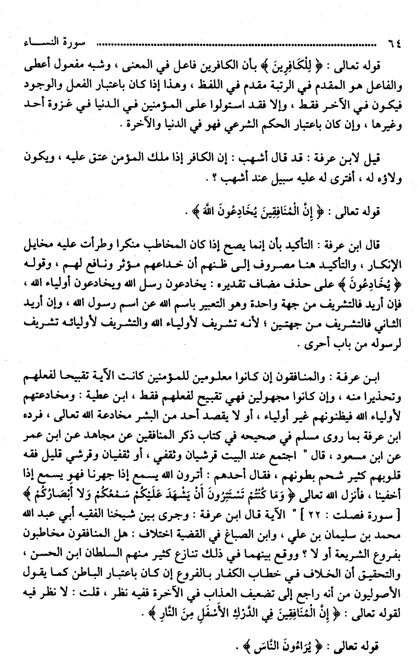 ابن عرفة: والمنافقون إن كانوا معلومين للمؤمنين كانت الآية تقبيحا لفعلهم وتحذيرا منه، وإن كانوا مجهولين فهي تقبيح لفعلهم فقط، ابن عطية: ومخادعتهم لأولياء الله فيظنونهم غير أولياء، أو لَا يقصد أحد من البشر مخادعة الله تعالى، فرده ابن عرفة: بما روى مسلم في صحيحه في كتاب ذكر المنافقين عن مجاهد عن ابن عمر عن ابن مسعود، قال " [اجْتَمَعَ عِنْدَ الْبَيْتِ ثَلَاثَةُ نَفَرٍ، قُرَشِيَّانِ وَثَقَفِيٌّ، أَوْ ثَقَفِيَّانِ وَقُرَشِيٌّ، قَلِيلٌ فِقْهُ قُلُوبِهِمْ، كَثِيرٌ شَحْمُ بُطُونِهِمْ، فَقَالَ أَحَدُهُمْ: أَتُرَوْنَ اللهَ يَسْمَعُ مَا نَقُولُ؟ وَقَالَ الْآخَرُ: يَسْمَعُ، إِنْ جَهَرْنَا، وَلَا يَسْمَعُ، إِنْ أَخْفَيْنَا وَقَالَ الْآخَرُ: إِنْ كَانَ يَسْمَعُ، إِذَا جَهَرْنَا، فَهُوَ يَسْمَعُ إِذَا أَخْفَيْنَا"، فَأَنْزَلَ اللهُ عَزَّ وَجَلَّ: {وَمَا كُنْتُمْ تَسْتَتِرُونَ أَنْ يَشْهَدَ عَلَيْكُمْ سَمْعُكُمْ وَلَا أَبْصَارُكُمْ وَلَا جُلُودُكُمْ} *] الآية. قال ابن عرفة: وجرى بين شيخنا الفقيه أبي عبد الله محمد بن سليمان بن علي، وابن الصباغ في القضية اختلاف: هل المنافقون مخاطبون بفروع الشريعة أو لَا؟ ووقع بينهما في ذلك تنازع كثير منهم السلطان ابن الحسن، والتحقيق أن الخلاف في خطاب الكفار بالفروع إن كان باعتبار الباطن كما يقول الأصوليون من أنه راجع إلى تضعيف العذاب في الآخرة ففيه نظر، قلت: لَا نظر فيه لقوله تعالى: (إِنَّ الْمُنَافِقِينَ فِي الدَّرْكِ الْأَسْفَلِ مِنَ النَّارِ).