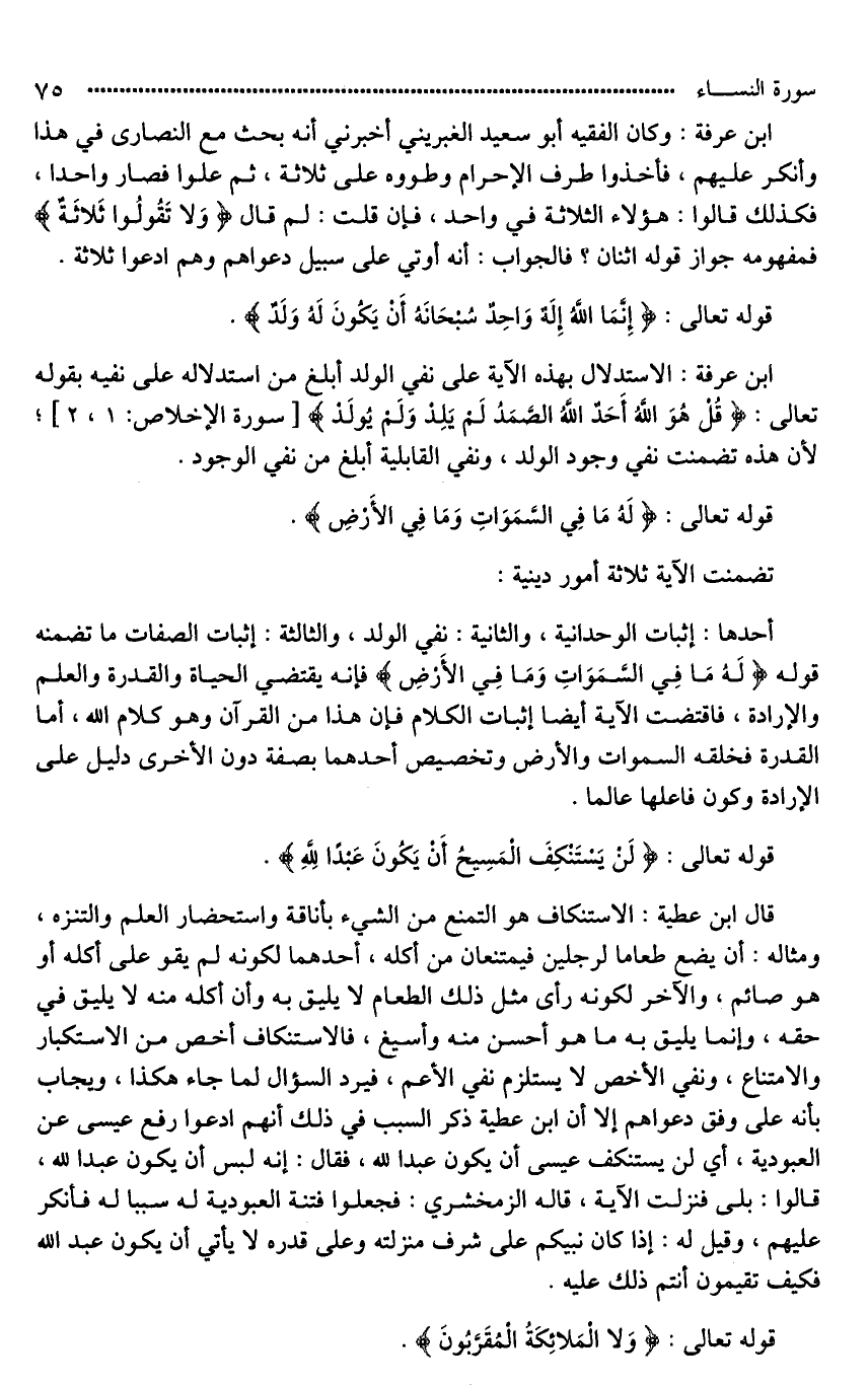 ابن عرفة: وكان الفقيه أبو سعيد الغبريني أخبرني أنه بحث مع النصارى في هذا وأنكر عليهم، فأخذوا طرف الإحرام وطووه على ثلاثة، ثم علوا فصار واحدا، فكذلك قالوا: هؤلاء الثلاثة في واحد، فإن قلت: لم قال (وَلَا تَقُولُوا ثَلَاثَةٌ) فمفهومه جواز قوله اثنان؟ فالجواب: أنه أوتي على سبيل دعواهم وهم ادعوا ثلاثة.
