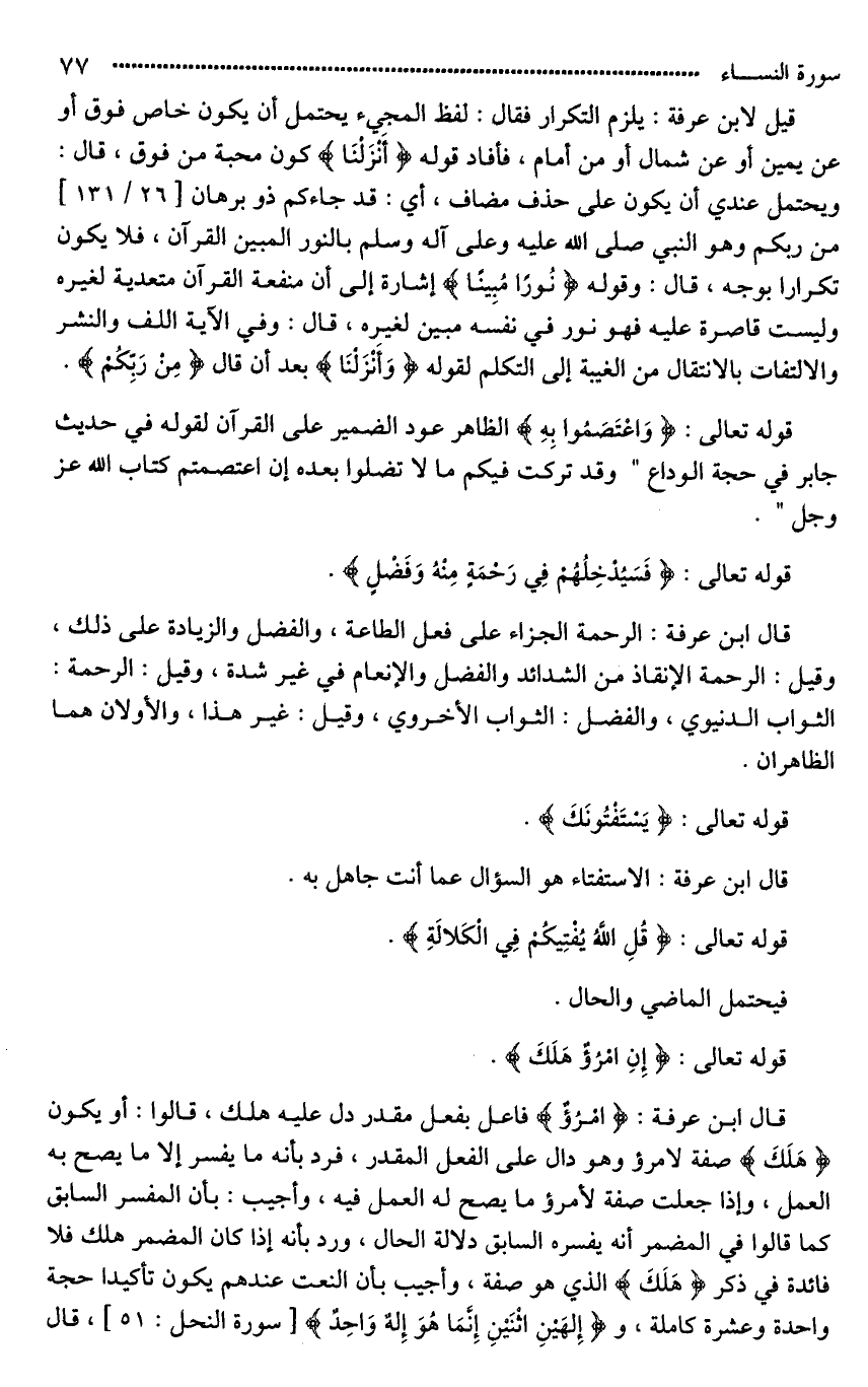 قيل لابن عرفة: يلزم التكرار فقال: لفظ المجيء يحتمل أن يكون خاص فوق أو عن يمين أو عن شمال أو من أمام، فأفاد قوله (أَنْزَلْنَا) كون محبة من فوق، قال: ويحتمل عندي أن يكون على حذف مضاف، أي: قد جاءكم ذو برهان من ربكم وهو النبي صلى الله عليه وعلى آله وسلم بالنور المبين القرآن، فلا يكون تكرارا بوجه، قال: وقوله (نُورًا مُبِينًا) إشارة إلى أن منفعة القرآن متعدية لغيره وليست قاصرة عليه فهو نور في نفسه مبين لغيره، قال: وفي الآية اللف والنشر والالتفات بالانتقال من الغيبة إلى التكلم لقوله (وَأَنْزَلْنَا) بعد أن قال (مِنْ رَبِّكُمْ).