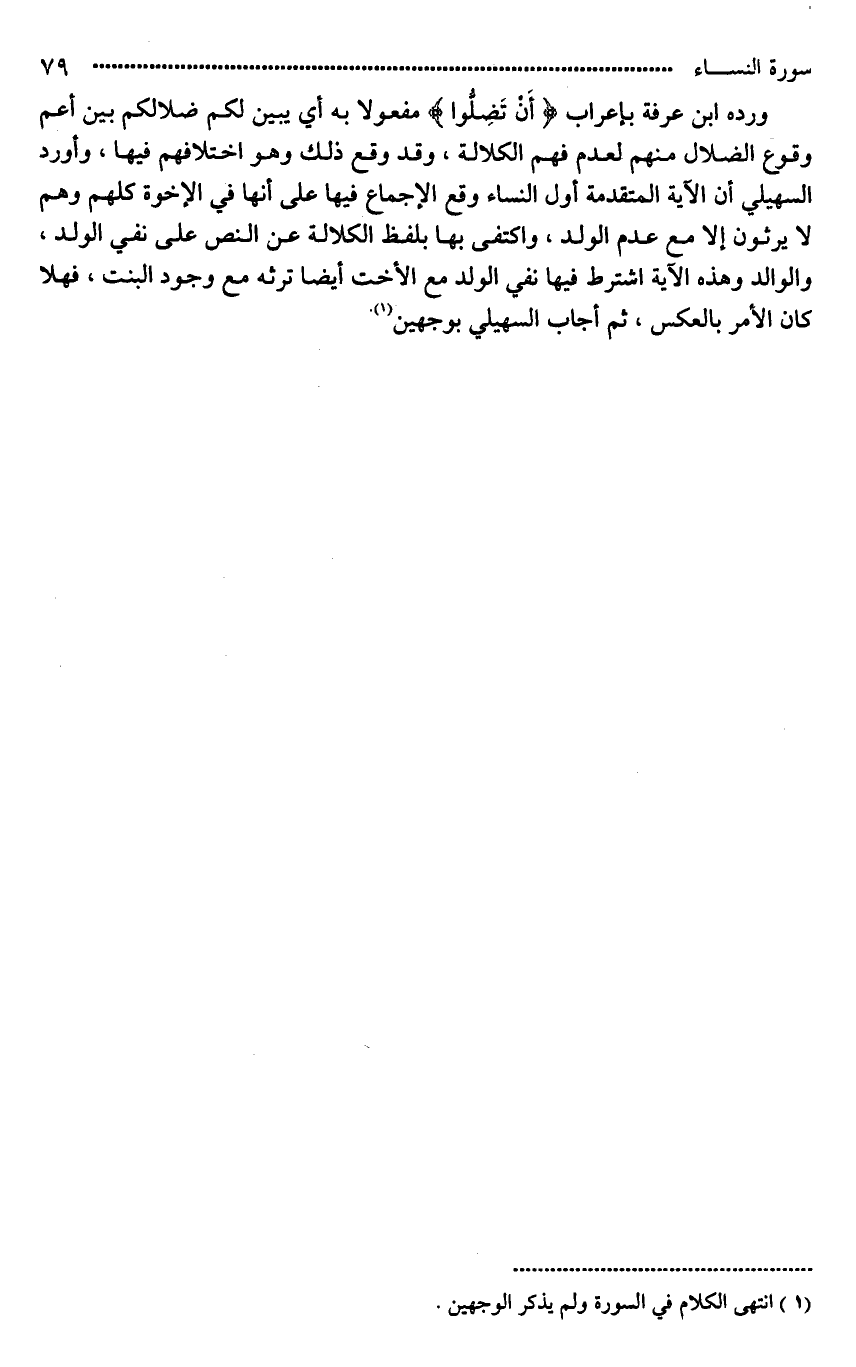 ورده ابن عرفة بإعراب (أن تضلوا) مفعولا به أي يبين لكم ضلالكم بين أعم وقوع الضلال منهم لعدم فهم الكلالة، وقد وقع ذلك وهو اختلافهم فيها، وأورد السهيلي أن الآية المتقدمة أول النساء وقع الإجماع فيها على أنها في الإخوة كلهم وهم لا يرثون إلا مع عدم الولد، واكتفى بها بلفظ الكلالة عن النص على نفي الولد، والوالد وهذه الآية اشترط فيها نفي الولد مع الأخت أيضا ترثه مع وجود البنت، فهلا كان الأمر بالعكس، ثم أجاب السهيلي بوجهين (¬1).