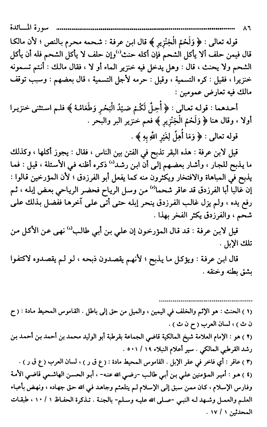قوله تعالى: (وَلَحْمُ الْخِنْزِيرِ) قال ابن عرفة: شحمه محرم بالنص؛ لأن مالكا قال فيمن حلف ألا يأكل الشحم فإن أكله حنث، وإن حلف لَا يأكل الشحم فله أن يأكل الشحم ولا يحنث، قال: وهل يدخل فيه خنزير الماء أو لَا، فقال مالك: أنتم تسمونه خنزيرا، فقيل: كره التسمية، وقيل: حرمه لأجل التسمية، قال بعضهم: وسبب توقف مالك فيه تعارض عمومين: