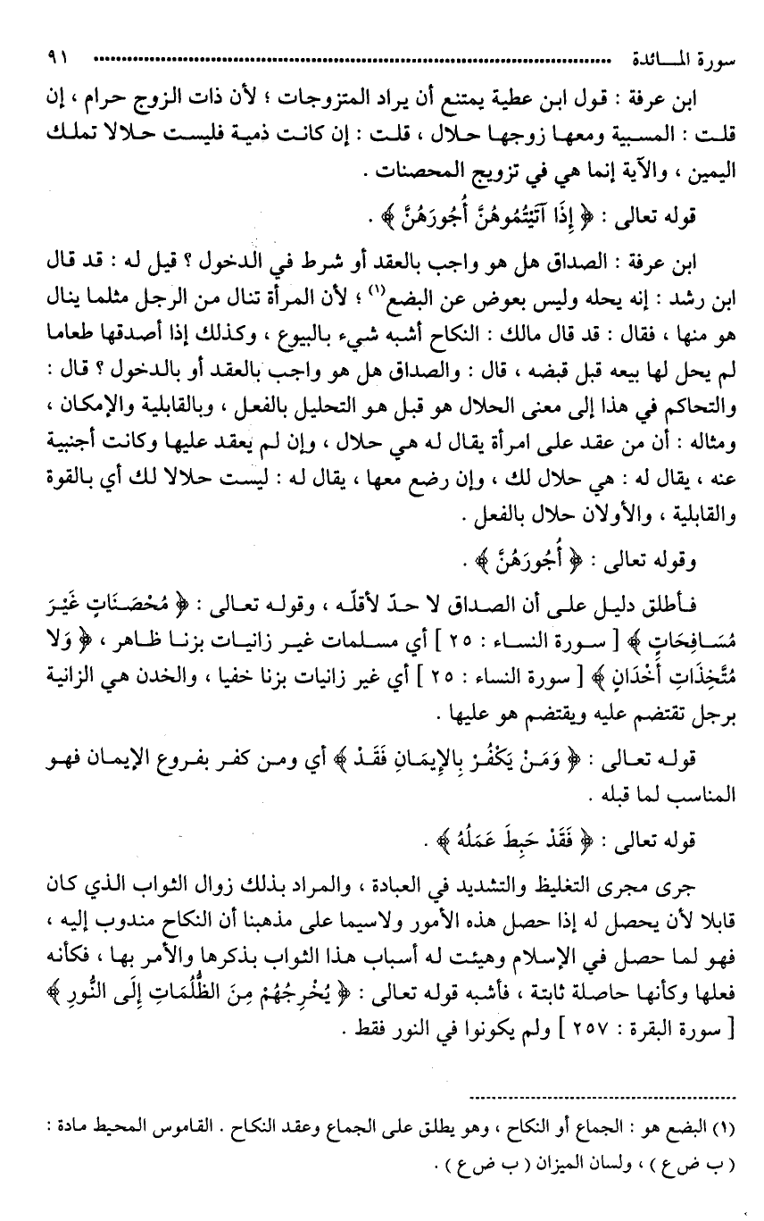 ابن عرفة: قول ابن عطية يمتنع أن يراد المتزوجات؛ لأن ذات الزوج حرام، إن قلت: المسبية ومعها زوجها حلال، قلت: إن كانت ذمية فليست حلالا تملك اليمين، والآية إنما هي في تزويج المحصنات.