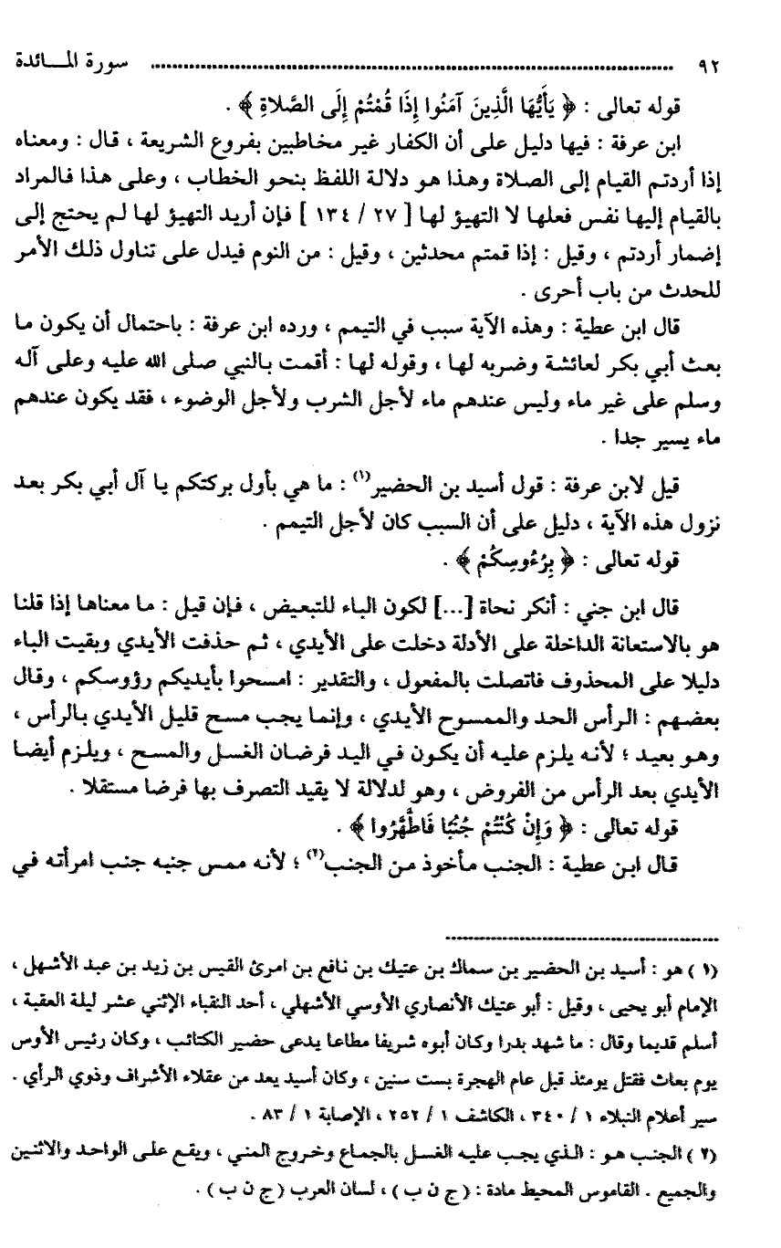 ابن عرفة: فيها دليل على أن الكفار غير مخاطبين بفروع الشريعة، قال: ومعناه إذا أردتم القيام إلى الصلاة وهذا هو دلالة اللفظ بنحو الخطاب، وعلى هذا فالمراد بالقيام إليها نفس فعلها لَا التهيؤ لها فإن أريد التهيؤ لها لم يحتج إلى إضمار أردتم، وقيل: إذا قمتم محدثين، وقل: من النوم فيدل على تناول ذلك الأمر للحدث من باب أحرى.