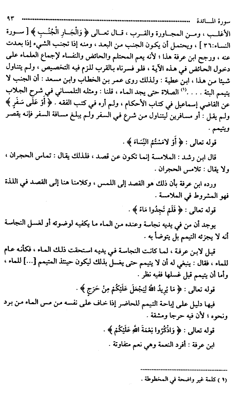 الأغلب، ومن المجاورة والقرب، قال تعالى (وَالْجَارِ الْجُنُبِ)، ويحتمل أن يكون الجنب من البعد، ومنه [تجنب*] الشيَء إذا بعدت عنه، ورجح ابن عرفة هنا؛ لأنه يعم المحتلم والحائض والنفساء لإجماع العلماء على دخول الحائض في هذه الآية، فلو فسرناه بالقرب للزم فيه التخصيص، ولم يتناول شيئا من هذا، ابن عطية: ولذلك [رأى*] عمر بن للخطاب [وابن مسعود*]: أن الجنب لا يتيمم ألبتَّة [بل يدع*] (¬1) الصلاة حتى يجد الماء، قلنا: ومثله التلمساني في شرح الجلاب عن القاضي إسماعيل في كتاب الأحكام، ولم أره في كتب الفقه (أَوْ عَلَى سَفَرٍ) ولم يقل: أو مسافرين ليتناول من شرع في السفر ولم يبلغ مسافة السفر فإنه يقصر ويتيمم.