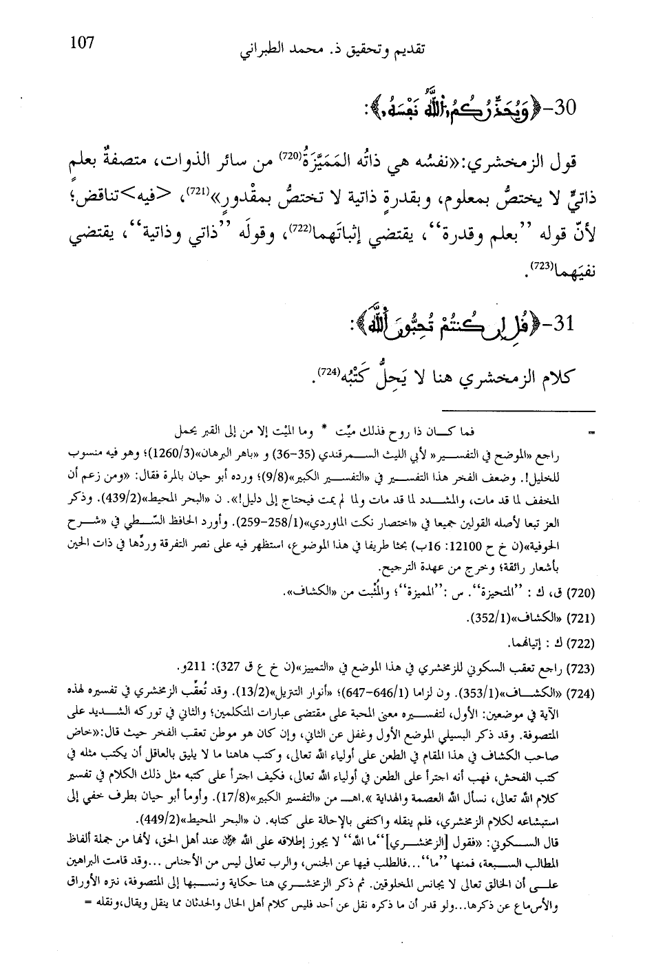 قول الزمخشري: "نفسُه هي ذاتُه المَمَيَّزَةُ من سائر الذوات، متصفةٌ بعلمٍ ذاتيٍّ لا يختصُّ بمعلوم، وبقدرةٍ ذاتية لا تختصُّ بمقْدورٍ"، فيه تناقض؛ لأنّ قوله "بعلم وقدرة"، يقتضي إثباتَهما، وقولَه "ذاتي وذاتية"، يقتضي نفيَهما.