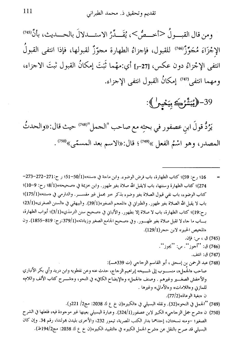 ومن قال القبولُ أخصُّ، يُقَدِّرُ الاستدلالَ بالحديث، بأنَّ الإِجْزَاءَ مُجَوِّزٌ للقبول، فإجزاءُ الطهارة مجوّزٌ لقبولها، فإذا انتفى القبولُ انتفى الإجْزاءُ دون عكس، أي: مهْما ثَبَتَ إمكانُ القبول ثبتَ الإجزاء، ومهما انتفى إمكانُ القبول انتفى الإجزاء.