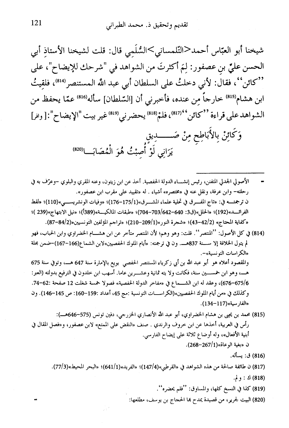 شيخنا أبو العبّاس أحمد التّلمساني السّلَمِي قال: قلت لشيخنا الأستاذِ أبي الحسن عليِّ بنِ عصفور: لِمَ أكثرتَ من الشواهد في "شرحك للإيضاح"، على "كائن"، فقال: لأني دخلتُ على السلطان أبي عبد اللَّه المستنصر، فلقِيتُ ابن هشام خارجاً مِن عنده، فأخبرني أن السّلطان سأله عمّا يحفظ من الشواهد على قراءة "كائن"، فلمْ يحضرني غير بيت "الإيضاح": [وافر]