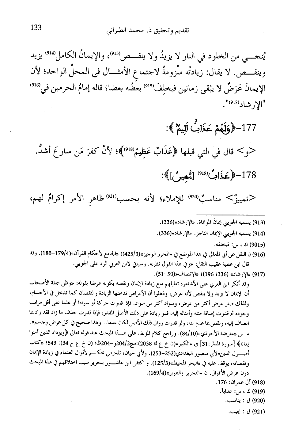 يُنجي من الخلود في النار لا يزيدُ ولا ينقص، والإيمان الكامل يزيد وينقص. لا يقال: زيادتُه ملْزومةٌ لاجتماعِ الأمثال في المحلِّ الواحد؛ لأن الإيمانَ عَرَضٌ لا يبْقى زمانين فيخلِفَ بعضُه بعضا؛ قاله إمامُ الحرمين في "الإرشاد".