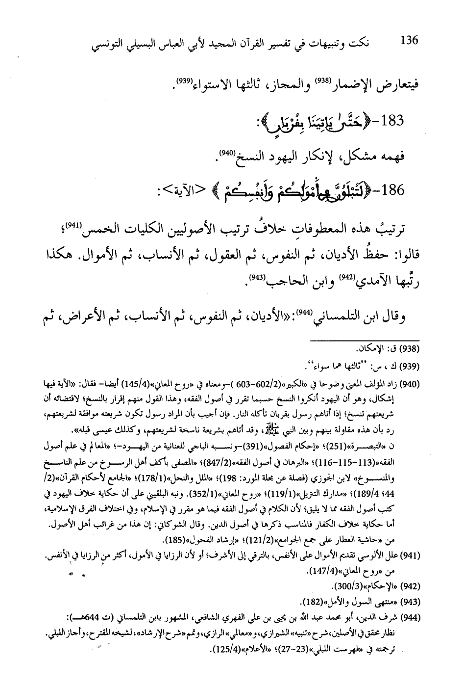 وقال ابن التلمساني: "الأديان، ثم النفوس، ثم الأنساب، ثم الأعراض، ثم