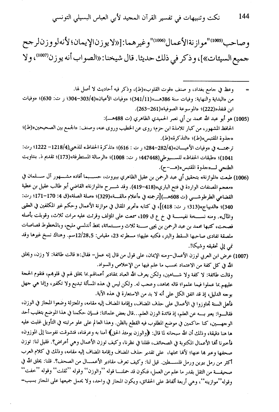وصاحب موازنة الأعمال وغيرهما: "لا يوزن الإيمان؛ لأنه لو وزن لرجح جميع السيئات"، وذكر في ذلك حديثا. قال شيخنا: "الصواب أنه يوزن، ولا