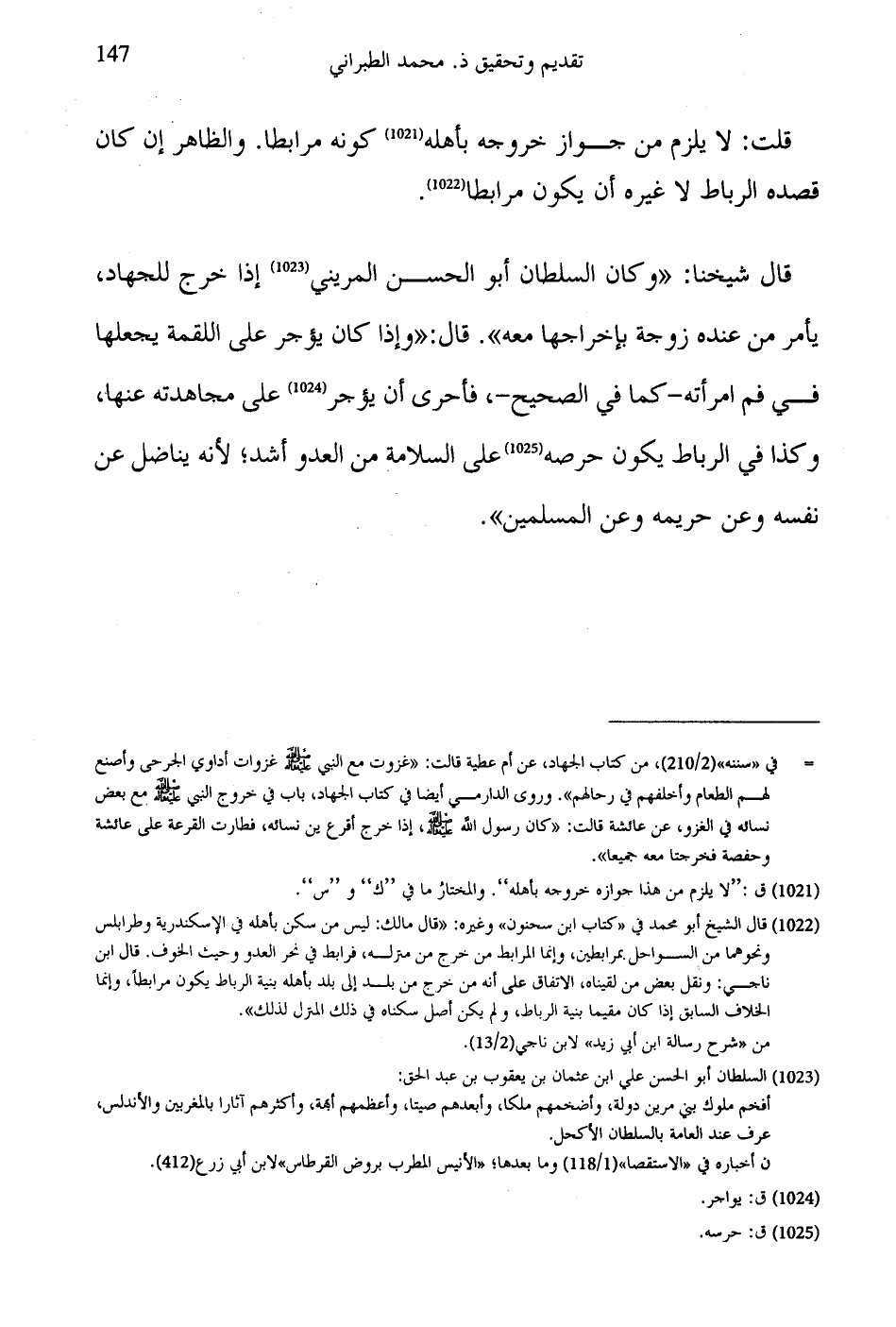 قال شيخنا: "وكان السلطان أبو الحسن المريني إذا خرج للجهاد، يأمر من عنده زوجة بإخراجها معه". قال: "وإذا كان يؤجر على اللقمة يجعلها في فم امرأته -كما في الصحيح-، فأحرى أن يؤجر على مجاهدته عنها، وكذا في الرباط يكون حرصه على السلامة من العدو أشد، لأنه يناضل عن نفسه وعن حريمه وعن المسلمين".