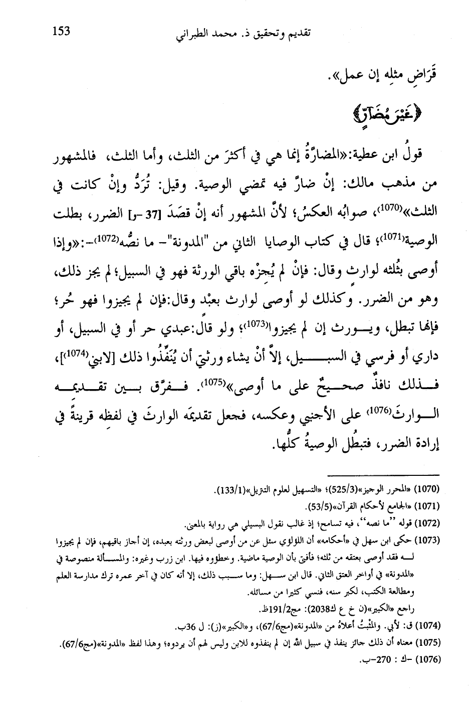 قولُ ابن عطية: "المضارةُ إنما هي في أكثرَ من الثلث، وأما الثلث، فالمشهور من مذهب مالك: إنْ ضارَّ فيه تمضي الوصية. وقيل: تُرَدُّ وإنْ كانت في الثلث"، صوابُه العكسُ؛ لأن المشهور أنه إنْ قصَدَ الضرر، بطلت الوصية؛ قال في كتاب الوصايا الثاني من "المدونة" -ما نصُّه-: "وإذا أوصى بثُلثه لوارثٍ وقال: فإنْ لم يُجِزْه باقي الورثة فهو في السبيل؛ لم يجز ذلك، وهو من الضرر. وكذلك لو أوصى لوارث بعبْدٍ وقال: فإن لم يجيزوا فهو حُر؛ فإنها تبطل، ويورث إن لم يجيزوا؛ ولو قال: عبدي حر أو في السبيل، أو داري أو فرسي في السبيل، إلا أنْ يشاء ورثتي أن يُنَفِّذُوا ذلك لابني، فذلك نافذٌ صحيحٌ على ما أوصى". ففرَّق بين تقديمِه الوارثَ على الأجبي وعكسه، فجعل تقديمَه الوارثَ في لفظِه قرينةً في إرادة الضرر، فتبطُل الوصيةُ كلُّها.