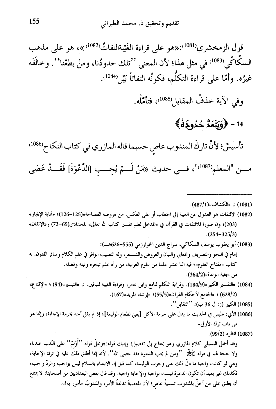 قول الزمخشري: "هو على قراءة الغَيْبة التفاتٌ"، هو على مذهب السكّاكّي في مثل هذا؛ لأن المعنى "تلك حدودُنا، ومنْ يطعْنا". وخالَفَه غيرُه. وأمّا على قراءة التكلُّم، فكونُه التفاتاً بَيِّن.