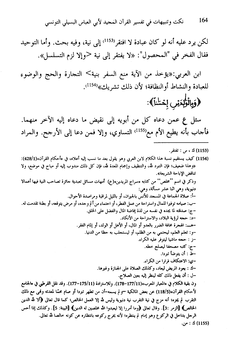 ابن العربي: "يؤخذ من الآية منع السفر بنية التجارة والحج والوضوء للعبادة والنشاط أو النظافة؛ لأن ذلك تشريك".
