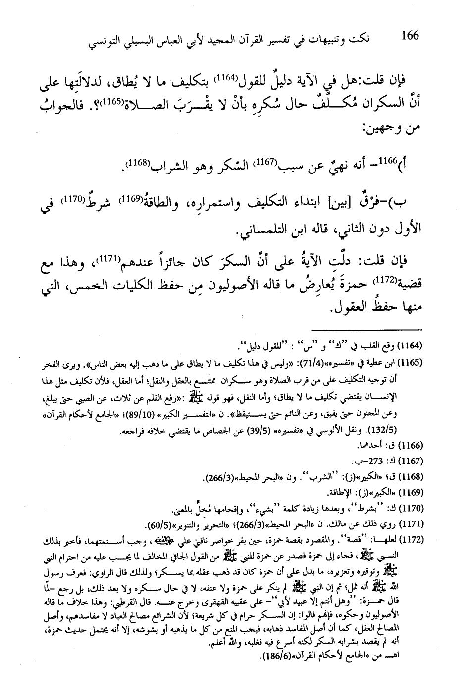 فإن قلت: دلَّتِ الآيةُ على أن السكرَ كان جائزاً عندهم، وهذا مع قضية حمزةَ يُعارِضُ ما قاله الأصوليون مِن حفظ الكليات الخمس، التي منها حفظُ العقول.