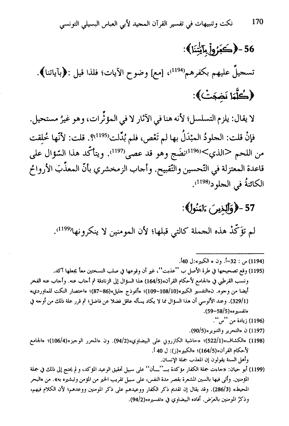 لا يقال: يلزم التسلسل؛ لأنه هنا في الآثار لا في المؤثِّرات، وهو غيرُ مستحيل. فإنْ قلت: الجلودُ المبْدَلُ بها لم تَعْص، فلم بُدِّلت؟. قلت: لأنّها خلِقت من اللحم الذي نضَج وهو قد عصى. ويتأكّد هذا السّؤال على قاعدة المعتزلة في التّحسين والتّقبيح. وأجاب الزمخشري بأنَّ المعذَّبَ الأرواحُ الكائنةُ في الجلود.
