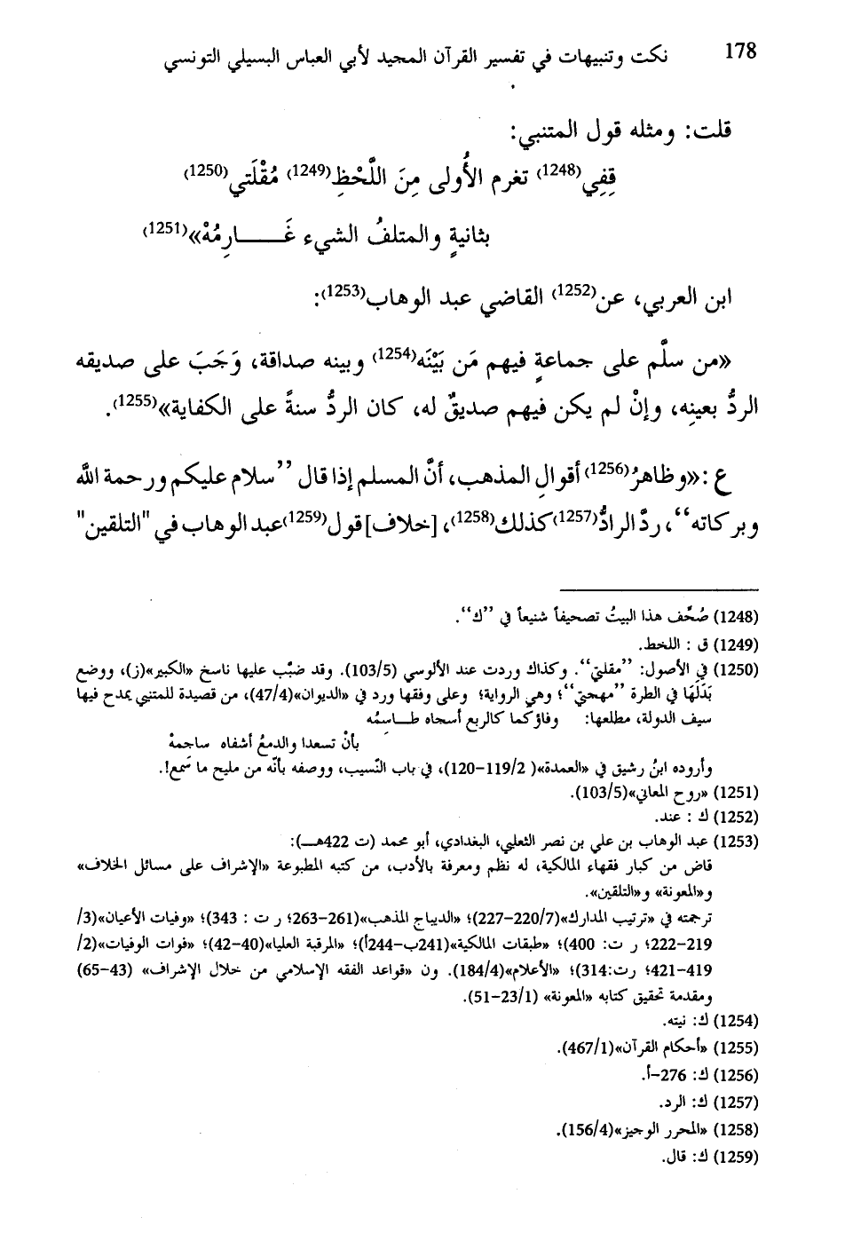 ع: "وظاهرُ أقوالِ المذهب، أنَّ المسلم إذا قال "سلام عليكم ورحمة الله وبركاته"، رد الرادُّ كذلك، خلاف قول عبد الو هاب في "التلقين"