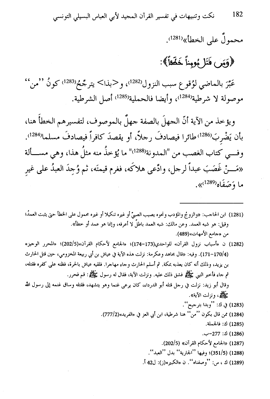 ويؤخذ من الآية أنّ الجهلَ بالصفة جهلٌ بالموصوف، لتفسيرهم الخطأَ هنا، بأن يَضْرِبَ طائرا فيصادفَ رجلاً، أو يقصدَ كافرا فيصادفَ مسلما.