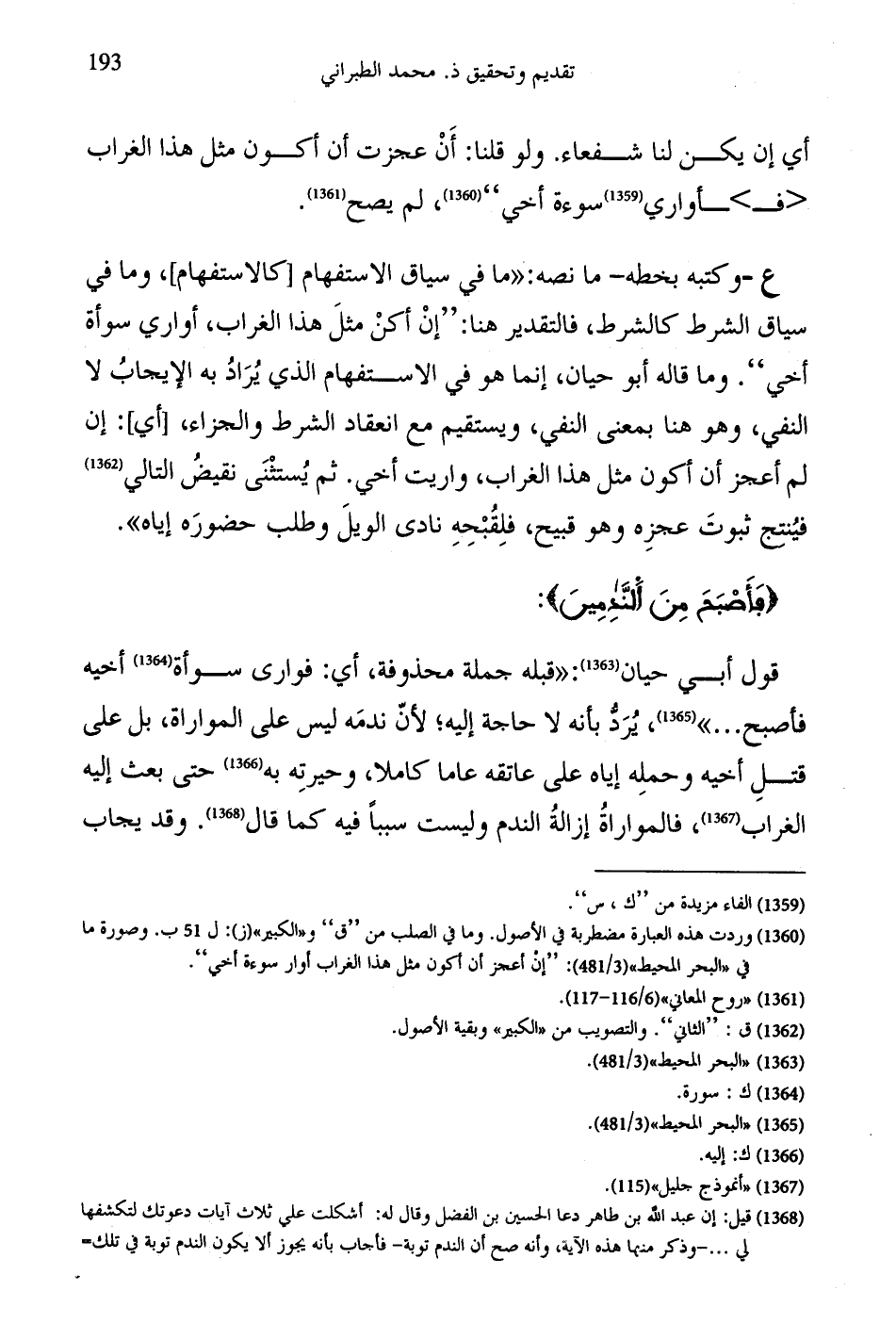 ع - وكتبه بخطه - ما نصه: "ما في سياق الاستفهام كالاستفهام، وما في سياق الشرط كالشرط، فالتقدير هنا: "إنْ أكنْ مثلَ هذا الغراب، أواري سوأة أخي". وما قاله أبو حيان، إنما هو في الاستفهام الذي يُرَادُ به الإيجابُ لا النفي، وهو هنا بمعنى النفي، ويستقيم مع انعقاد الشرط والجزاء، أي: إن لم أعجز أن أكون مثل هذا الغراب، واريت أخي. ثم يُستثْنَى نقيضُ التالي فيُنتج ثبوتَ عجزِه وهو قبيح، فلِقُبْحِهِ نادى الويلَ وطلب حضورَه إياه".