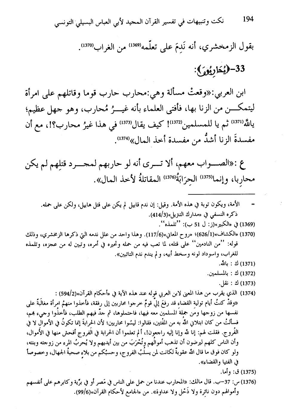 ابن العربي: "وقعتْ مسألة وهي: محارب حارب قوما وقاتلهم على امرأة ليتمكن من الزنا بها، فأفتى العلماء بأنَّه غيرُ مُحارب، وهو جهل عظيم؛ يالله ثم يا للمسلمين! كيف يقال في هذا غيرُ محارب؟!، مع أن مفسدةَ الزنا أشدُّ من مفسدة أخذ المال".