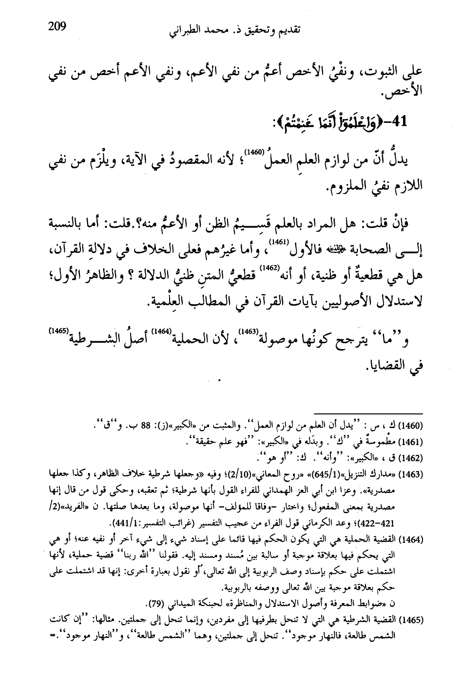 فإنْ قلت: هل المراد بالعلم قَسِيمُ الظن أو الأعمُّ منه؟. قلت: أما بالنسبة إلى الصحابة - رضي الله عنهم - فالأول، وأما غيرُهم فعلى الخلاف في دلالةِ القرآن، هل هي قطعيةٌ أو ظنية، أو أنه قطعيُّ المتنِ ظنيُّ الدلالة؛ والظاهرُ الأول؛ لاستدلال الأصوليين بآيات القرآن في المطالب العِلْمية.