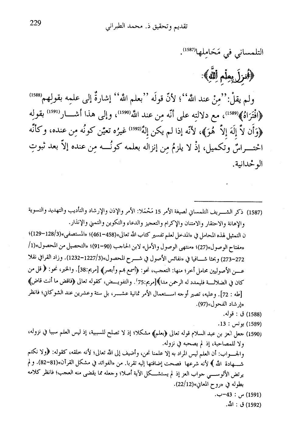ولم يقلْ: "مِنْ عند الله"؛ لأن قولَه "بعلم اللَّه" إشارةٌ إلى علمِه بقولِهم (افْتَرَاهُ)، مع دلالتِه على أنه مِن عند اللَّه، وإلى هذا أشار بقولِه (وَأَنْ لَا إِلَهَ إِلَّا هُوَ)، لأنه إذا لم يكن إِلهٌ غيرُه تعين كونُه مِن عنده، وكأنه احتراسٌ وتكميل، إذْ لا يلزمُ مِن إنزاله بعلمه كونُه مِن عنده إلا بعد ثبوتِ الوحْدانية.