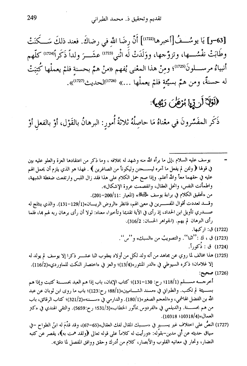 (يَا يوسُفُ) أخبرها أَن رِضَا اللَّهِ في رضاكَ. فعند ذلكَ سَكَنَتْ وطَابَتْ نفْسُها، وتزوَّجها، ووَلَدَتْ لَه اثْني عشَرَ ولداً ذَكَراً كلّهم أنبياءُ مرسلونَ، ومِنْ هذا المعْنى يُفهم "منْ همَّ بحسنةٍ فلمْ يعملْها كُتِبَتْ له حسنةٌ، ومن همَّ بسيئةٍ فلمْ يعملْها ... " الحديث".