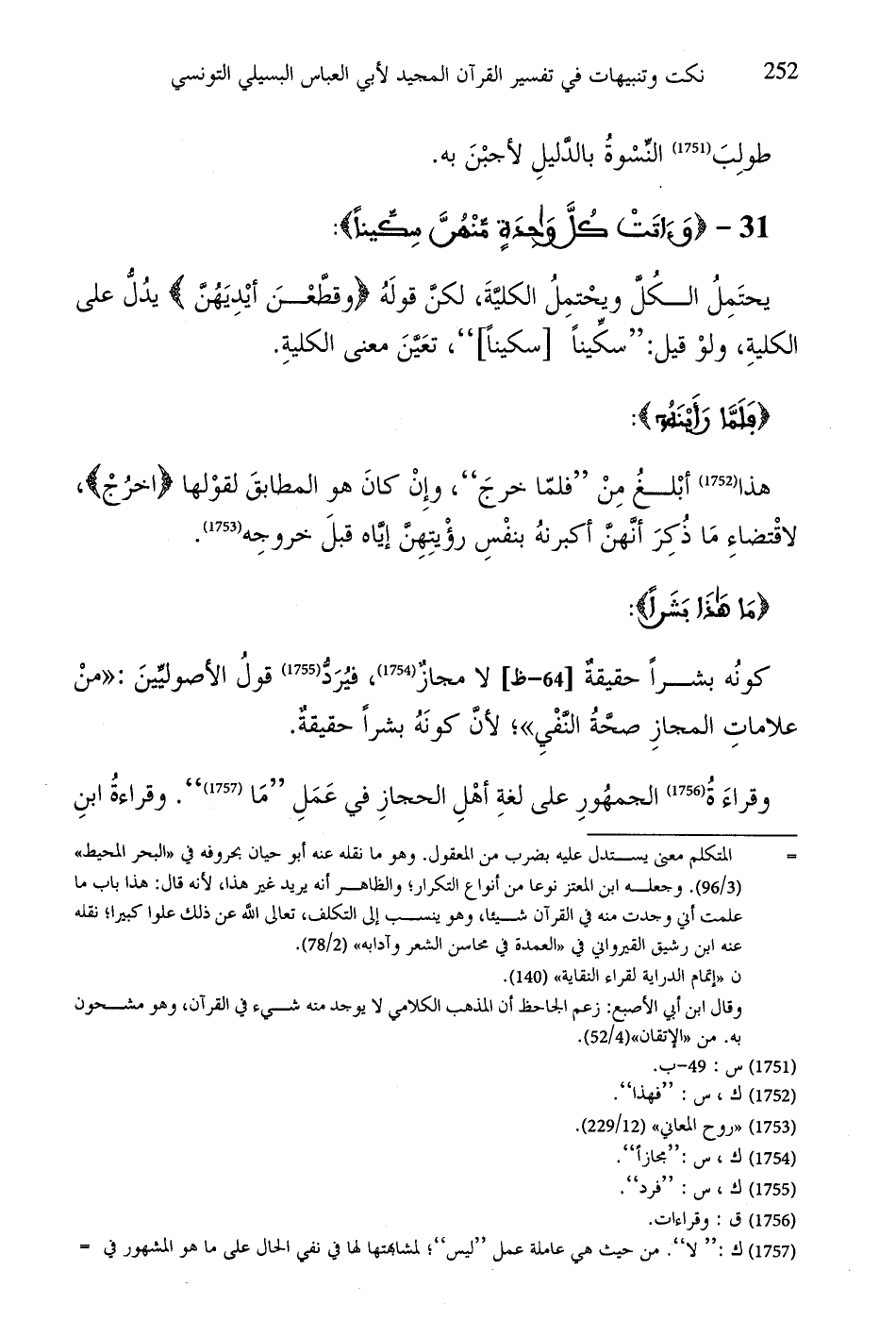 كونُه بشراً حقيقةٌ لا مجازٌ، فيُرَدُّ قولُ الأصوليِّينَ: "منْ علاماتِ المجازِ صحةُ النَّفْيِ"؛ لأن كونَهُ بشراً حقيقةٌ.