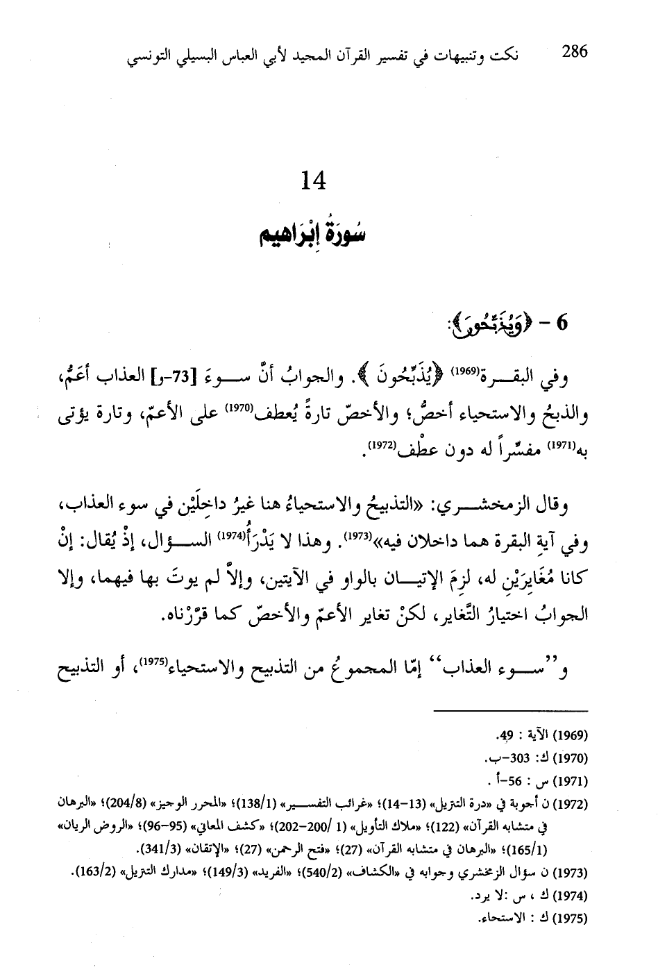 وفي البقرة (يُذَبِّحُونَ). والجوابُ أن (سوءَ العذاب) أعَمُّ، والذبحُ والاستحياء أخصُّ؛ والأخصّ تارةً يُعطف على الأعمّ، وتارة يؤتى به مفسِّراً له دون عطْف.