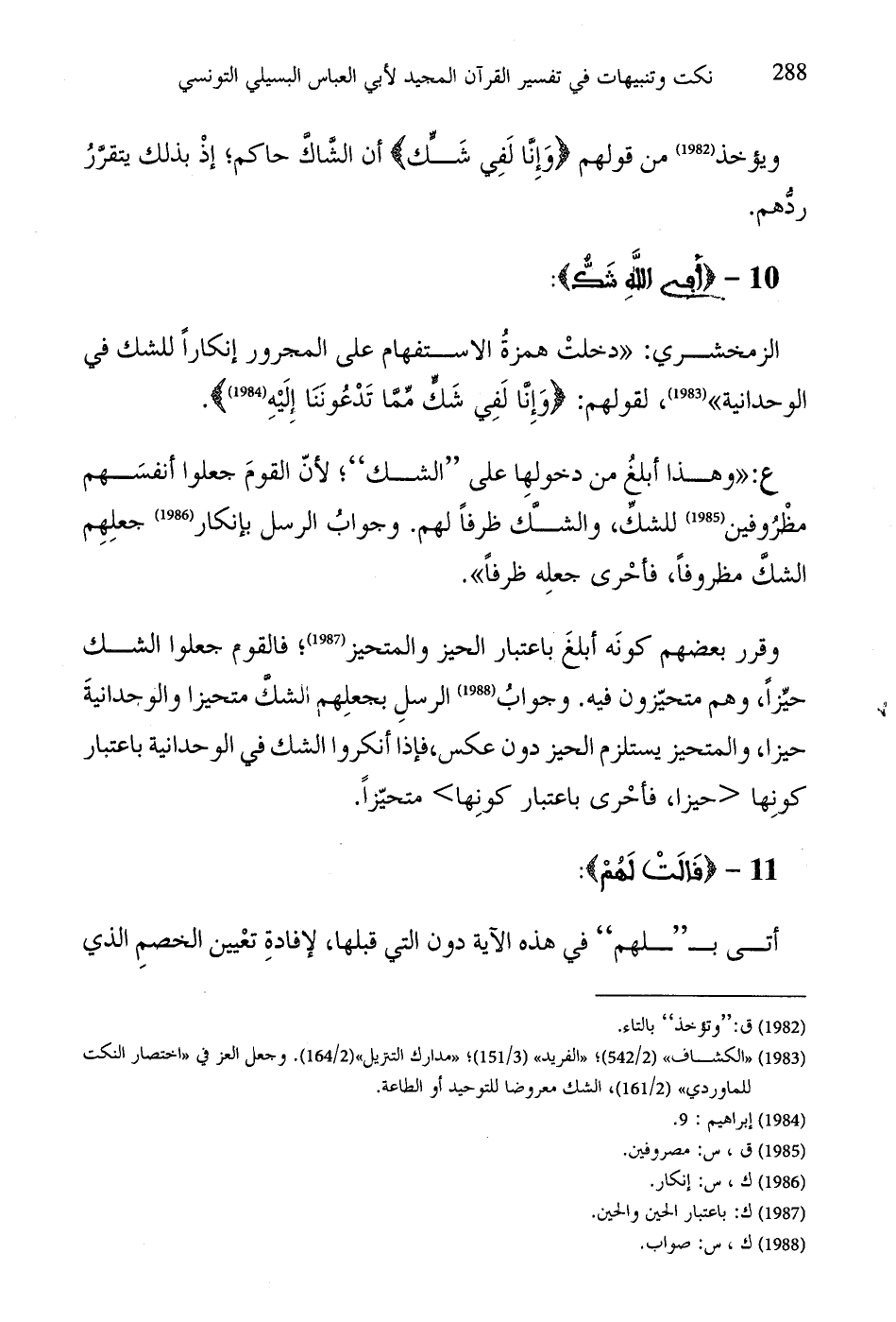 الزمخشري: "دخلتْ همزةُ الاستفهام على المجرور إنكاراً للشك في الوحدانية"، لقولهم: (وَإِنَّا لَفِي شَكٍّ مِمَّا تَدْعُونَنَا إِلَيْهِ).
