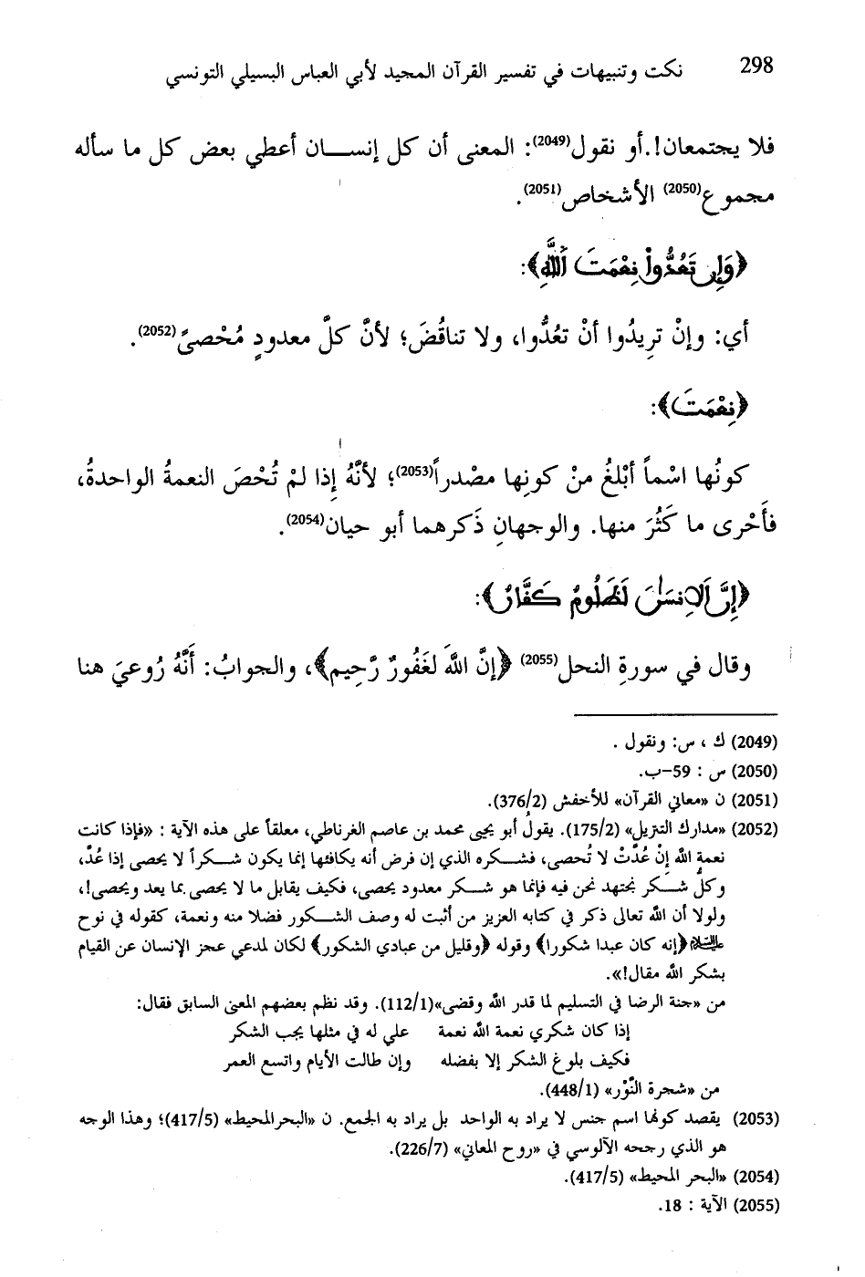 كونُها اسْماً أبْلغُ منْ كونِها مصْدراً؛ لأنهُ إِذا لمْ تُحْصَ النعمةُ الواحدةُ، فأحْرى ما كَثُرَ منها. والوجهانِ ذَكرهما أبو حيان.