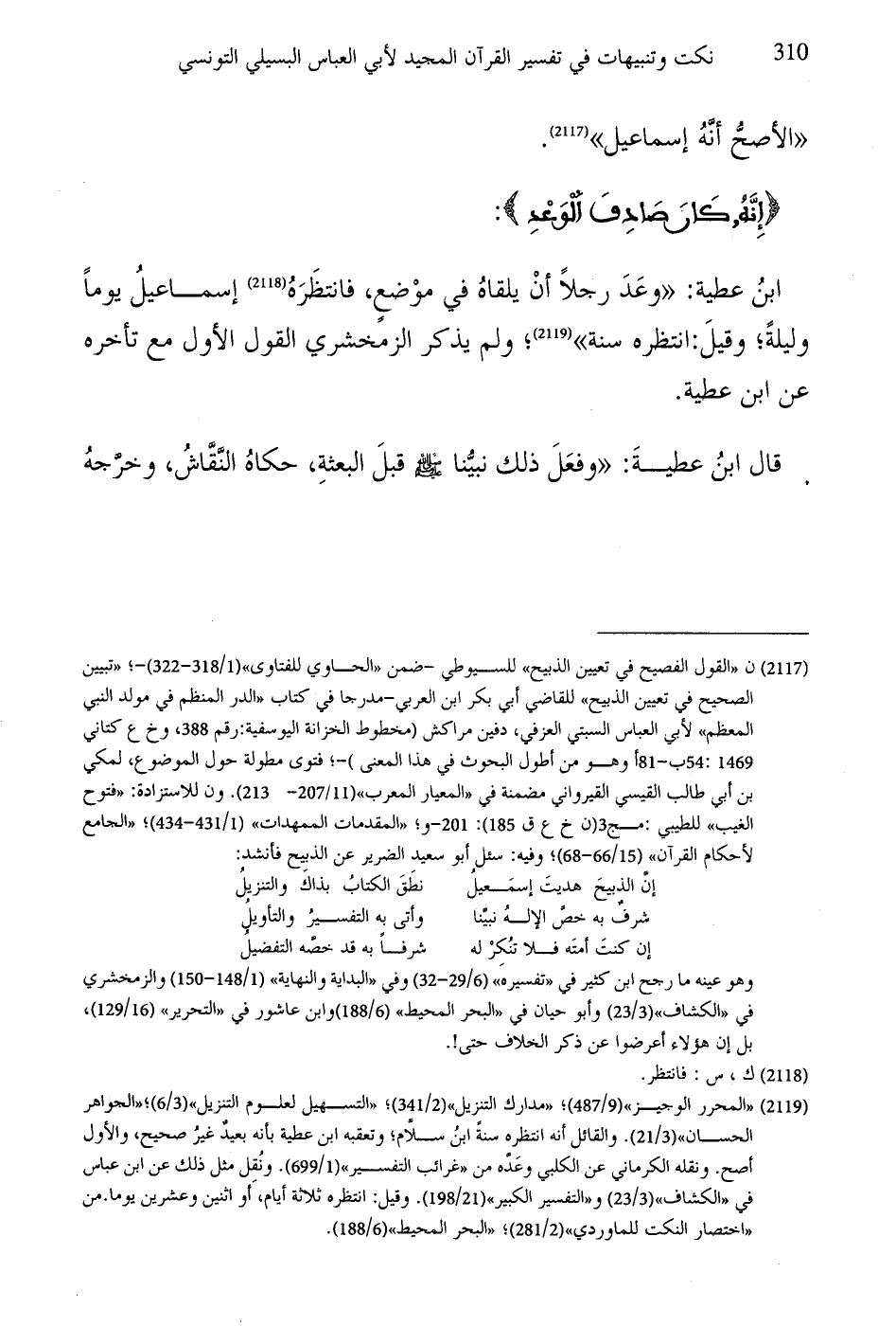 ابنُ عطية: "وعَدَ رجلاً أنْ يلقاهُ في موْضعٍ، فانتظَرَهُ إسماعيلُ يوماً وليلةً؛ وقيلَ: انتظره سنة"؛ ولم يذكر الزمخشري القول الأول مع تأخره عن ابن عطية.