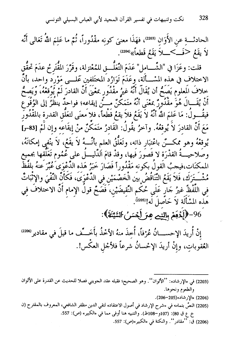 الحادثةِ عنِ الأَوَانِ، فهَذَا معنيَ كونِه مقْدُوراً، ثُمَّ ما عَلِمَ اللَّهُ تَعَالى أَنه لاَ يقَعُ فَلا يَقَعُ قَطعاً".