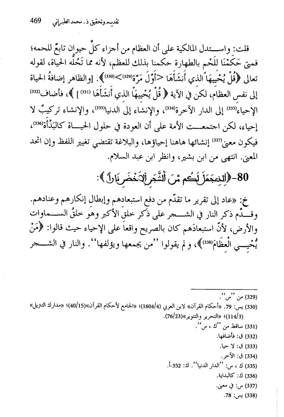 قلت: واستدل المالكية على أن العظام من أجزاء كلِّ حيوان تابعٌ للحمه؛ فمتى حَكَمْنَا للَحْم بالطهارة حكمنا بذلك للعظم، لأنه مما تَحُلُّه الحياة، لقوله تعالى (قُلْ يُحْيِيهَا الَّذِي أَنْشَأَهَا أَوَّلَ مَرَّةٍ). والظاهر إضافةُ الحياة إلى نفسِ العظام، لكن في الآية (قُلْ يُحْيِيهَا الَّذِي أَنْشَأَهَا)، فأضاف الإحياء إلى الدار الآخرة، والإنشَاء إلى الدنيا، والإنشاء تركيبٌ لا إحياء، لكن اجتمعت الأمة على أن العودة في حلول الحياة كالبَدْأَة، فيكون معنى إنشائها هاهنا إحياؤها، والبلاغة تقتضي تغيير اللفظ وإن اتحد المعنى. انتهى من ابن بشير، وانظر ابن عبد السلام.