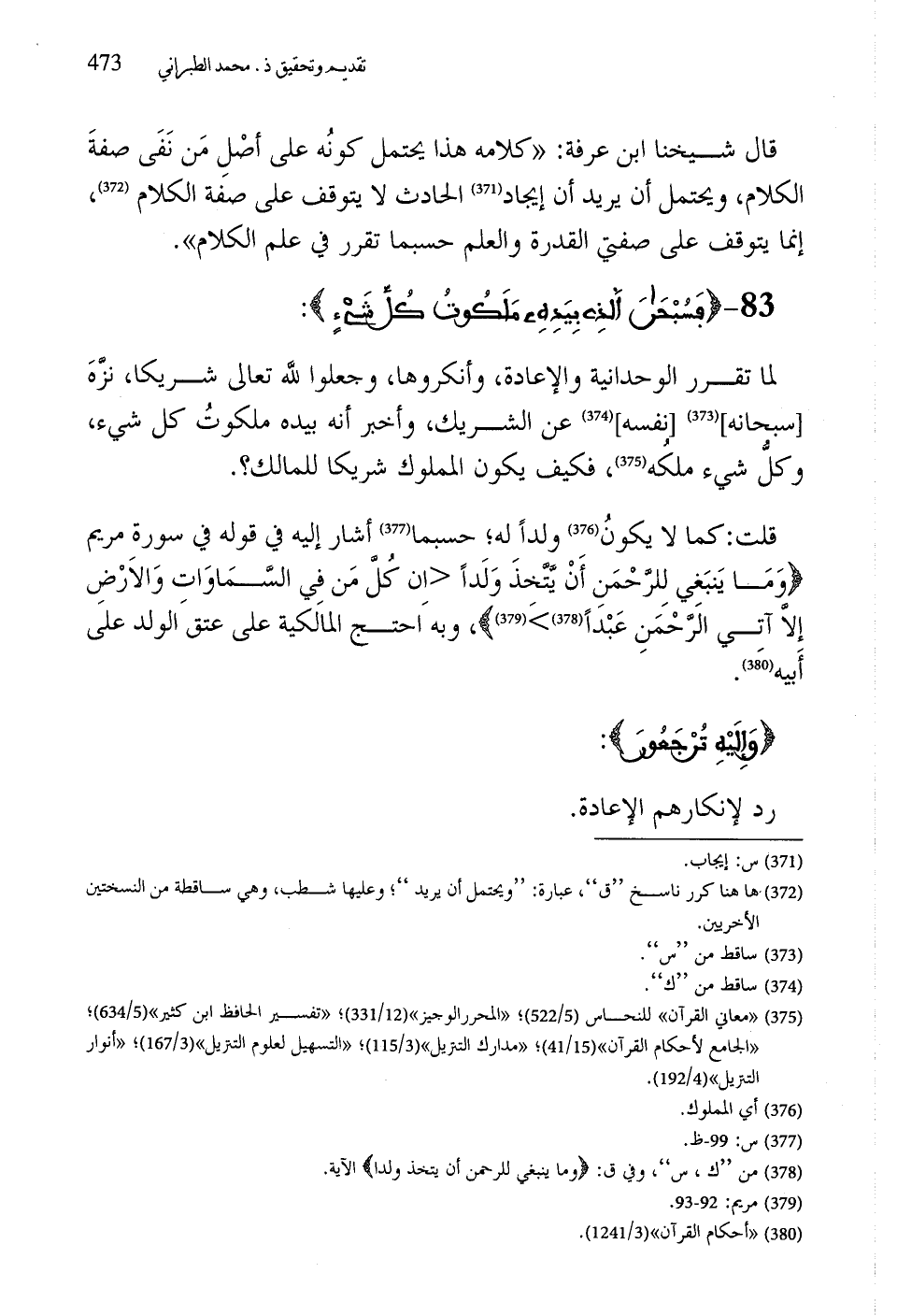 قال شيخنا ابن عرفة: "كلامه هذا يحتمل كونُه على أصْلِ مَن نَفَى صفةَ الكلام، ويحتمل أن يريد أن إيجاد الحادث لا يتوقف على صفة الكلام، إنما يتوقف على صفتي القدرة والعلم حسبما تقرر في علم الكلام".