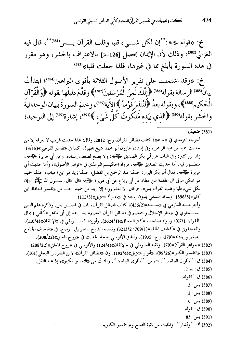 خ: "قوله - صلى الله عليه وسلم -: "إن لكل شيء قلبا وقلب القرآن يس"، قال فيه الغزالي: وذلك لأن الإيمان يحصل بالاعتراف بالحشر، وهو مقرر في هذه السورة بأبلغ مما في غيرها، فلذا جعلت قلبا".