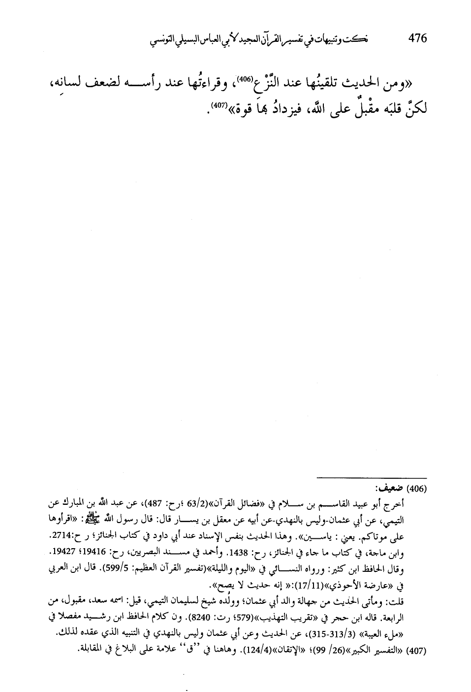 ومن الحديث تلقينُها عند النَّزْعِ (¬1)، وقراءتُها عند رأسه لضعف لسانِه، لكنَّ قلبَه مقْبلٌ على اللَّه، فيزدادُ بها قوة".