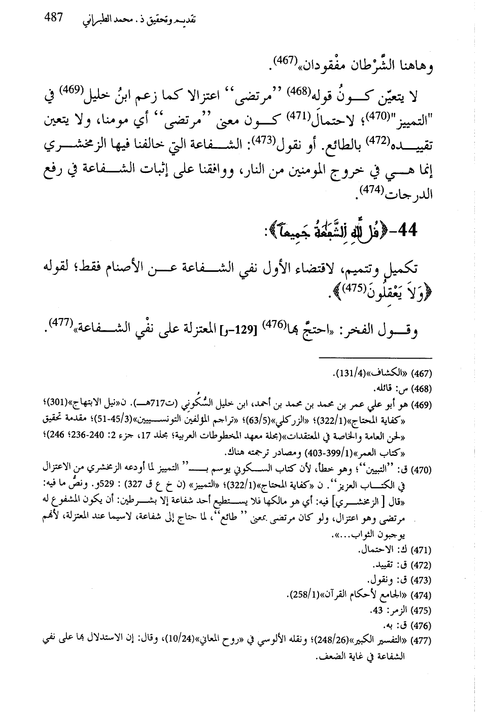 لا يتعيّن كونُ قوله "مرتضى" اعتزالا كما زعم ابنُ خليل في "التمييز"؛ لاحتمال كون معنى "مرتضى" أي مومنا، ولا يتعين تقييده بالطائع. أو نقول: الشفاعة التي خالفنا فيها الزمخشري إنما هي في خروج المومنين من النار، ووافقنا على إثبات الشفاعة فِي رفع الدرجات.