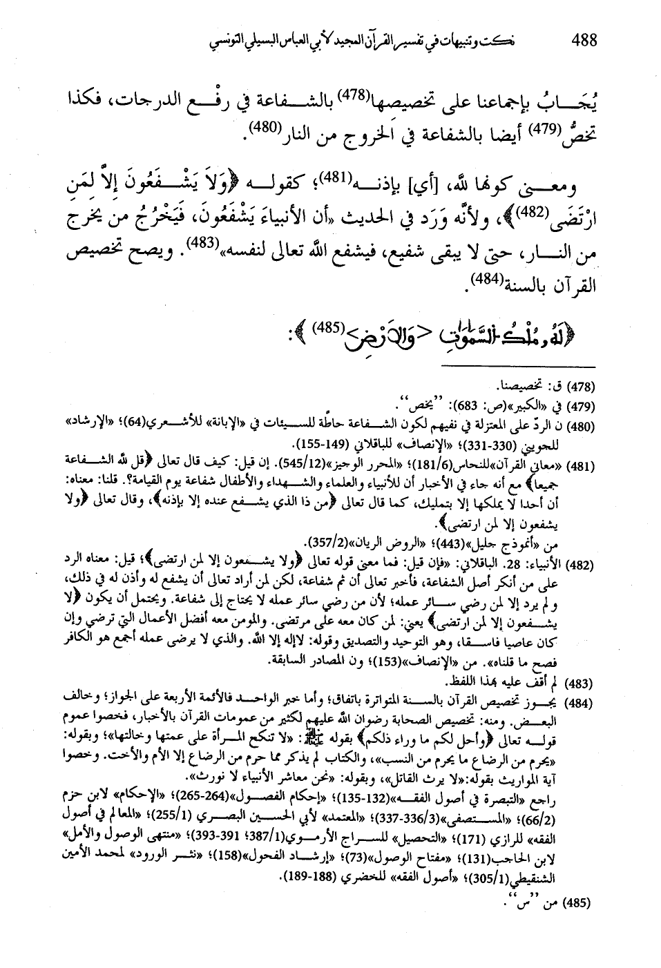 ومعنى كونها لله، أىِ بإذنه؛ كقوله (وَلاَ يَشْفَعُونَ إِلَّا لمَنِ ارْتَضَى)، ولأنه وَرَد في الحديث "أن الأنبياءَ يَشْفَعُونَ، فَيَخْرُجُ من يخَرج من النار، حتى لا يبقى شفيع، فيشفع الله تعالى لنفسه". ويصح تخصيص القرآن بالسنة.