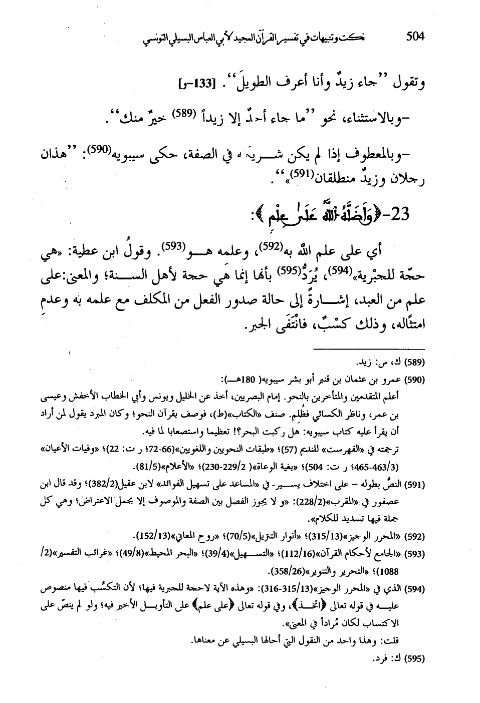 أي على علم اللَّه به، وعلمِه هو. وقولُ ابن عطيَّة: "هي حجّة للجبْرية"، يُرَدُّ بأنها إنما هي حجة لأهل السنة؛ والمعنى: على علم من العبد، إشارةً إلى حالة صدور الفعل من المكلف مع علمه به وعدم امتثاله، وذلك كسْبٌ، فانْتفَى الجبر.
