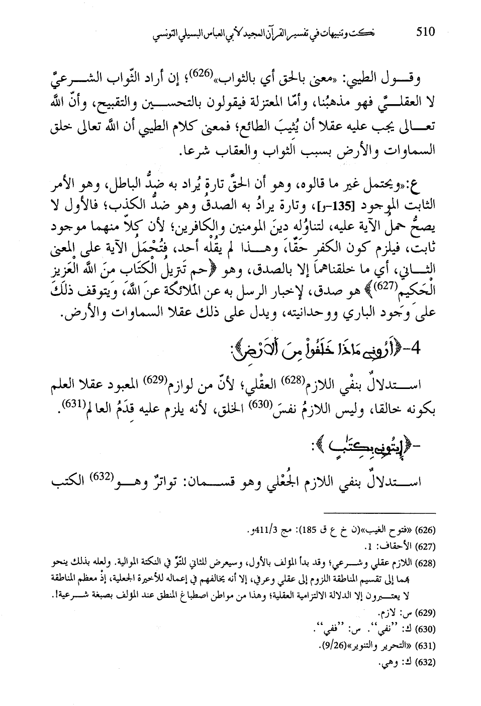 ع: "ويحتمل غير ما قالوه، وهو أن الحقَّ تارة يُراد به ضدُّ الباطل، وهو الأمر الثابت الموجود، وتارة يرادُ به الصدقُ وهو ضدُّ الكذب؛ فالأول لا يصحُّ حمل الآية عليه، لتناوُله دينَ المومنين والكافرين؛ لأن كلاّ منهما موجود ثابت، فيلزم كون الكفر حَقّا، وهذا لم يقُلْه أحد، فتُحْمَل الآية على المعنى الثاني، أي ما خلقناهما إلا بالصدق، وهو (حم تَنْزِيلُ الْكِتَابِ مِنَ اللَّهِ الْعَزِيزِ الْحَكِيمِ) هو صدق، لإخبار الرسل به عن الملائكة عن اللَّه، وَيتوقف ذلكَ عليَ وجود الباري ووحدانيته، ويدل على ذلك عقلا السماوات والأرض.