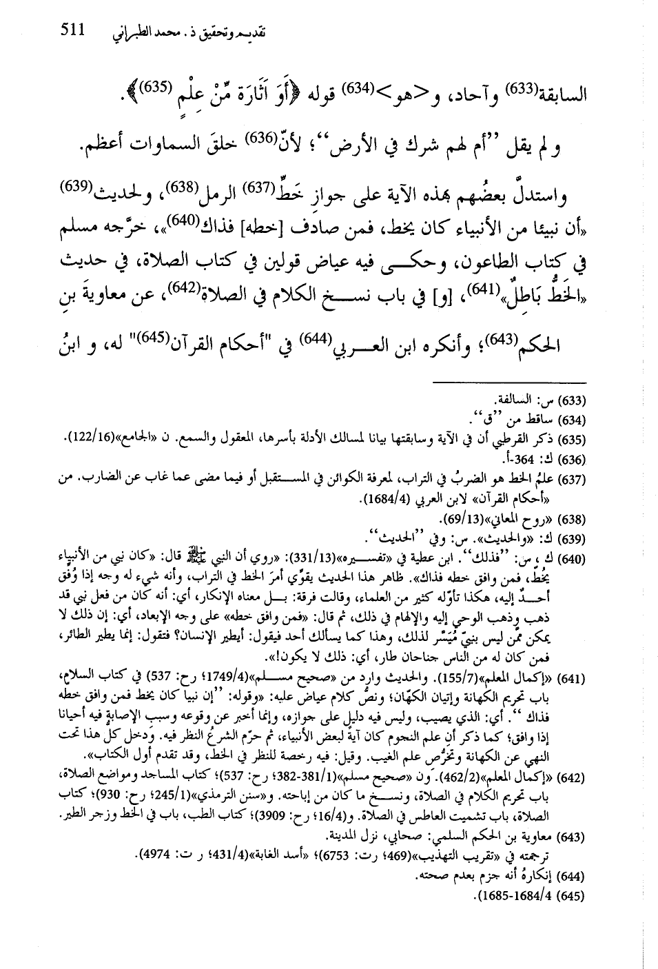 واستدل بعضُهم بهذه الآية على جوازِ خَطِّ الرمل، ولحديث "أن نبيئا من الأنبياء كان يخط، فمن صادف خطه فذاك"، خرَّجه مسلم في كتاب الطاعون، وحكى فيه عياض قولين في كتاب الصلاة، في حديث "الخَطُّ بَاطِلٌ"، وفي باب نسخ الكلام في الصلاة، عن معاويةَ بنِ الحكم؛ وأنكره ابن العربي في "أحكام القرآن" له، وابنُ