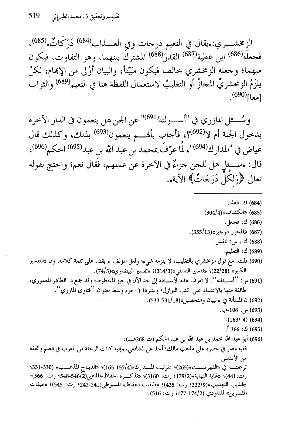 وسُئل المازري في "أسولته" عن الجن هل ينعمون في الدار الآخرة بدخول الجنة أم لا؟، فأجاب بأنهم ينعمون بذلك، وكذلك قال عياض في "المدارك"، لما عرَّفَ بمحمد بنِ عبد اللَّه بنِ عبد الحكم، قال: "سئل هل للجن جزاءٌ في الآخرة عن عملهم، فقال نعم؛ واحتج بقوله تعالى (وَلِكُلٍّ دَرَجَاتٌ) الآية".