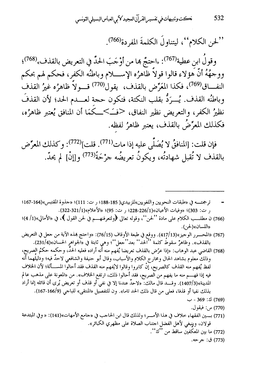 وقولُ ابنِ عطية: "احتجَّ بها من أوْجَبَ الحدَّ في التعريض بالقذف"؛ ووجهُهُ أنّ هؤلاء قالوا قولاً ظاهرُه الإسلام وباطنُه الكفر، فحكم لهم بحكم النفاق، فكذا المعَرِّض بالقذف، يقول قولاً ظاهرُه غيرُ القذف وباطنُه القذف. يُرَدُّ بقلب النكتة، فتكون حجة لعدم الحد؛ لأن القذفَ نظيرُ الكفر، والتعريض نظير النفاق، فَكمَا أن المنافق يُعتبر ظاهرُه، فكذلك المعرِّضُ بالقذف، يعتبر ظاهرُ لفظِه.